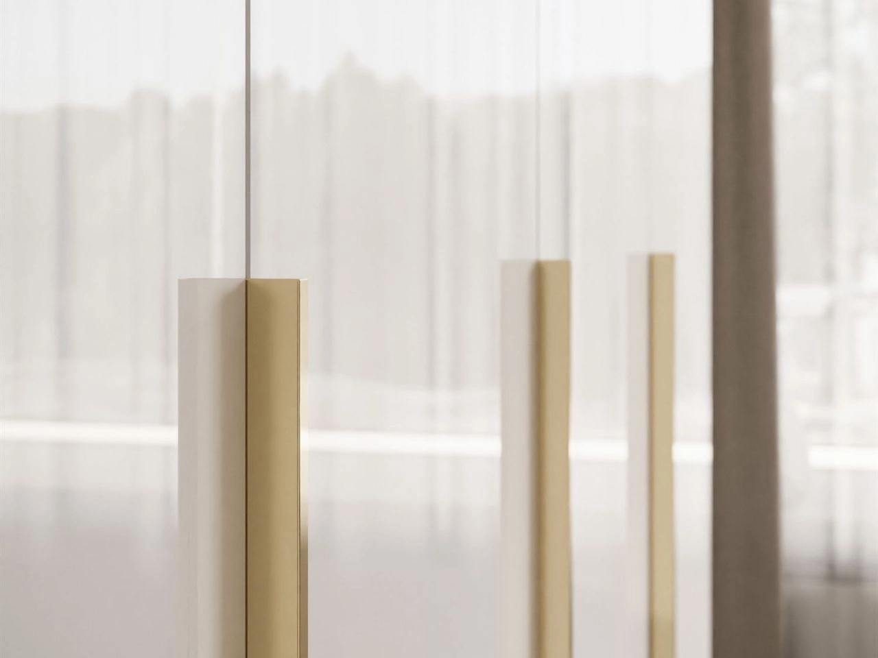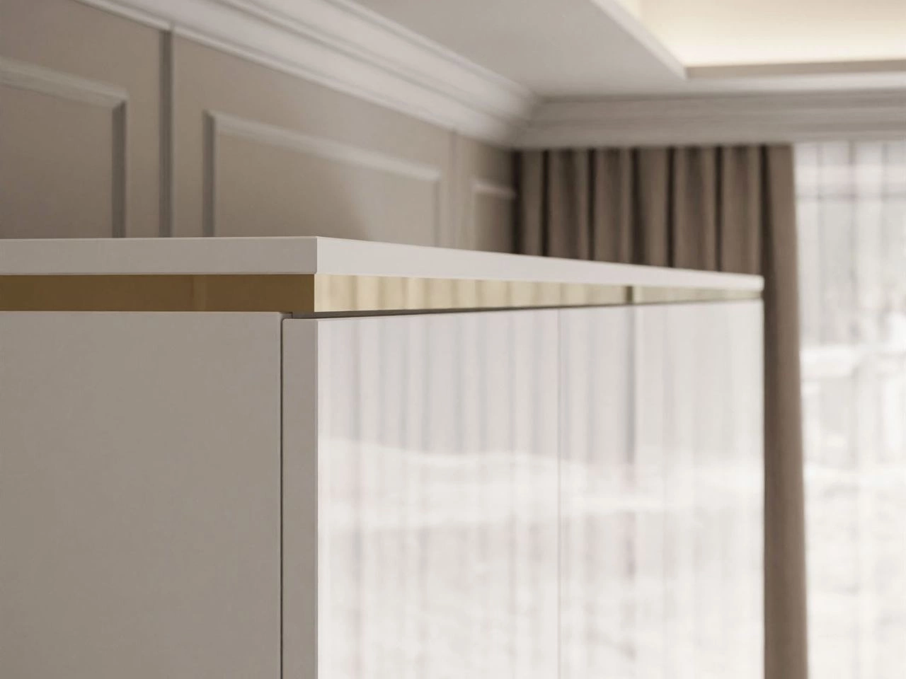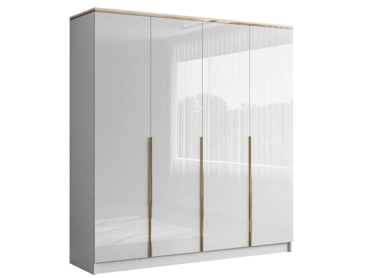 Szafa uchylna Evare w białym połysku to mebel, który łączy nowoczesny design z maksymalną funkcjonalnością, idealny do sypialni lub garderoby. Fronty w wysokim połysku w połączeniu z matowym korpusem tworzą efektowny kontrast, który dodaje wnętrzu lekkości i elegancji, a dekoracyjne obrzeże oraz uchwyty w złotym kolorze podkreśla ekskluzywny charakter mebla.