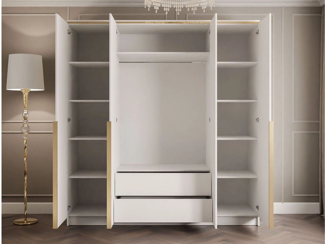 Szafa z drzwiami uchylnymi, szufladami i złotymi uchwytami Evare Biały Połysk