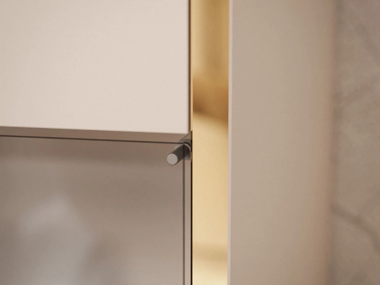 Szafka RTV posiada dwoje drzwi uchylnych ku dołowi, które również wyposażone są w system Push To Open. Dodatkowo, aby uniknąć niepotrzebnego trzaskania i swobodnego opadania drzwi, zaopatrzono je w praktyczne siłowniki. Wzdłuż blatu poprowadzono złotą listwę ozdobną - dokładne taką, jak w witrynie. Aby zapewnić stabilność i zapobiec odkształcaniu się mebla, szafka telewizyjna wyposażona została w dodatkową centralną nóżkę.