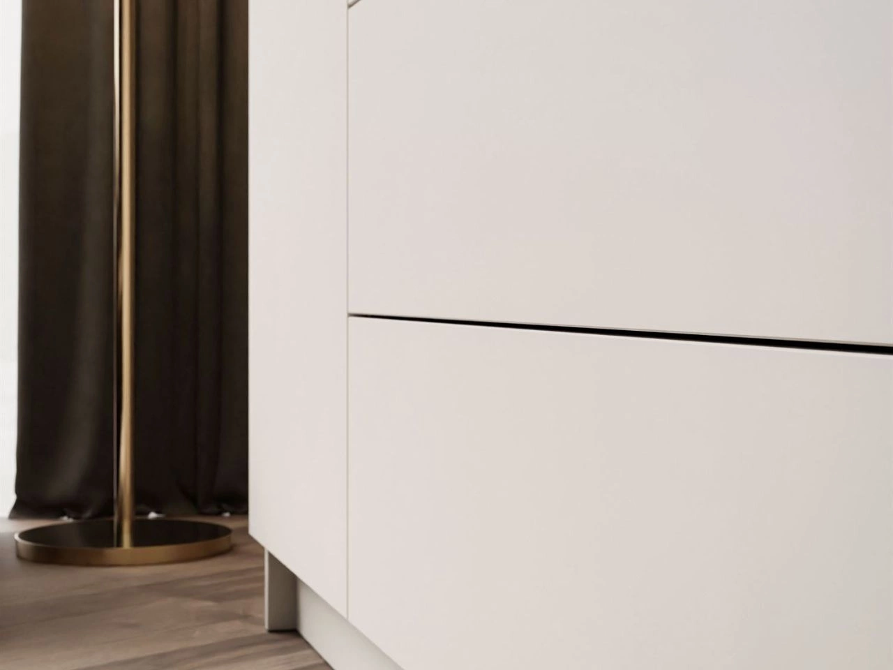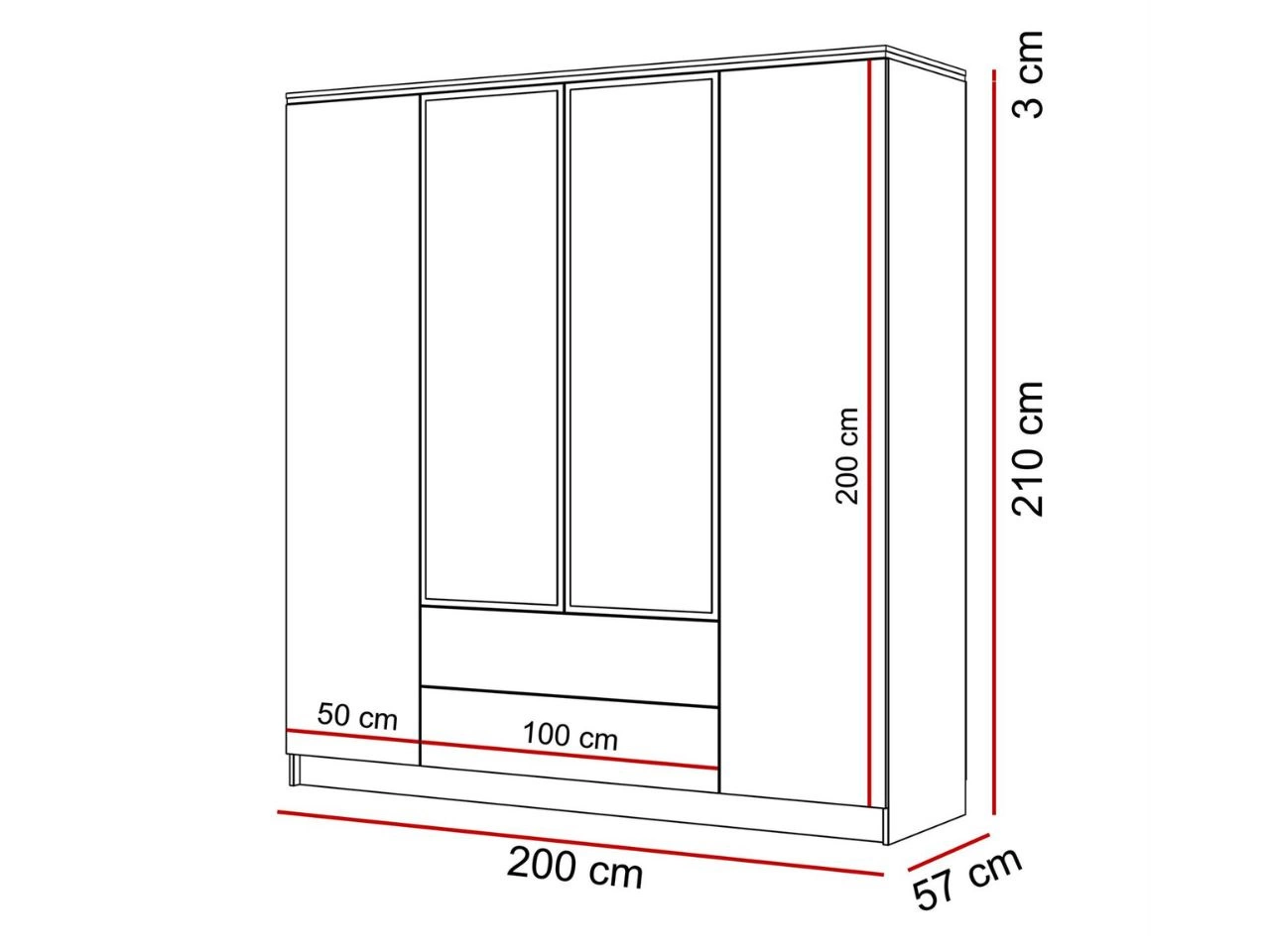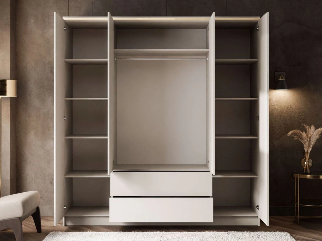 Czterodrzwiowa szafa oferuje dużą przestrzeń do przechowywania ubrań, dodatków i akcesoriów. Na froncie znajdują się dwie pojemne szuflady, które pozwalają wygodnie przechowywać najczęściej używane elementy garderoby. We wnętrzu szafy umieszczono dziewięć praktycznych półek oraz drążek na wieszaki, które umożliwiają komfortowe uporządkowanie odzieży. Zastosowany system push-to-open pozwala otwierać fronty lekkim naciśnięciem, co podkreśla minimalistyczną i nowoczesną linię mebla.
