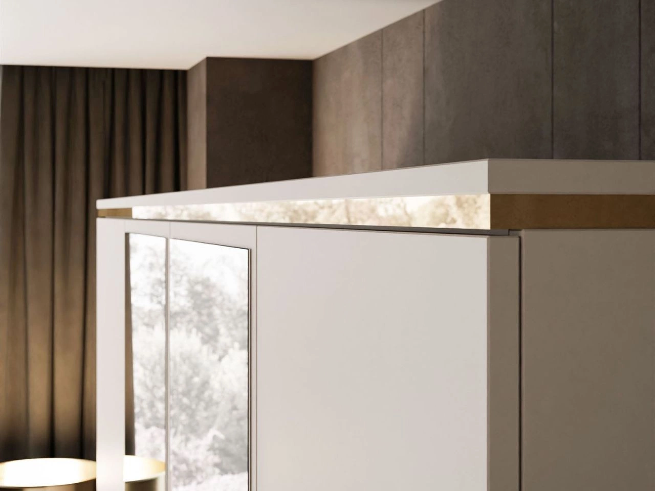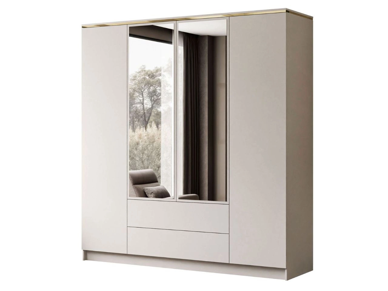 Szafa uchylna Evare w kolorze kaszmiru to połączenie nowoczesnego designu i maksymalnej funkcjonalności, które doskonale sprawdzi się w sypialni lub garderobie. Matowe fronty i korpus tworzą harmonijną całość, a dekoracyjny złoty pasek podkreśla luksusowy charakter mebla, dodając aranżacji wyjątkowej elegancji. Dodatkowym atutem są lustra umieszczone na frontach, które nie tylko optycznie powiększają przestrzeń, ale także zwiększają komfort codziennego użytkowania.