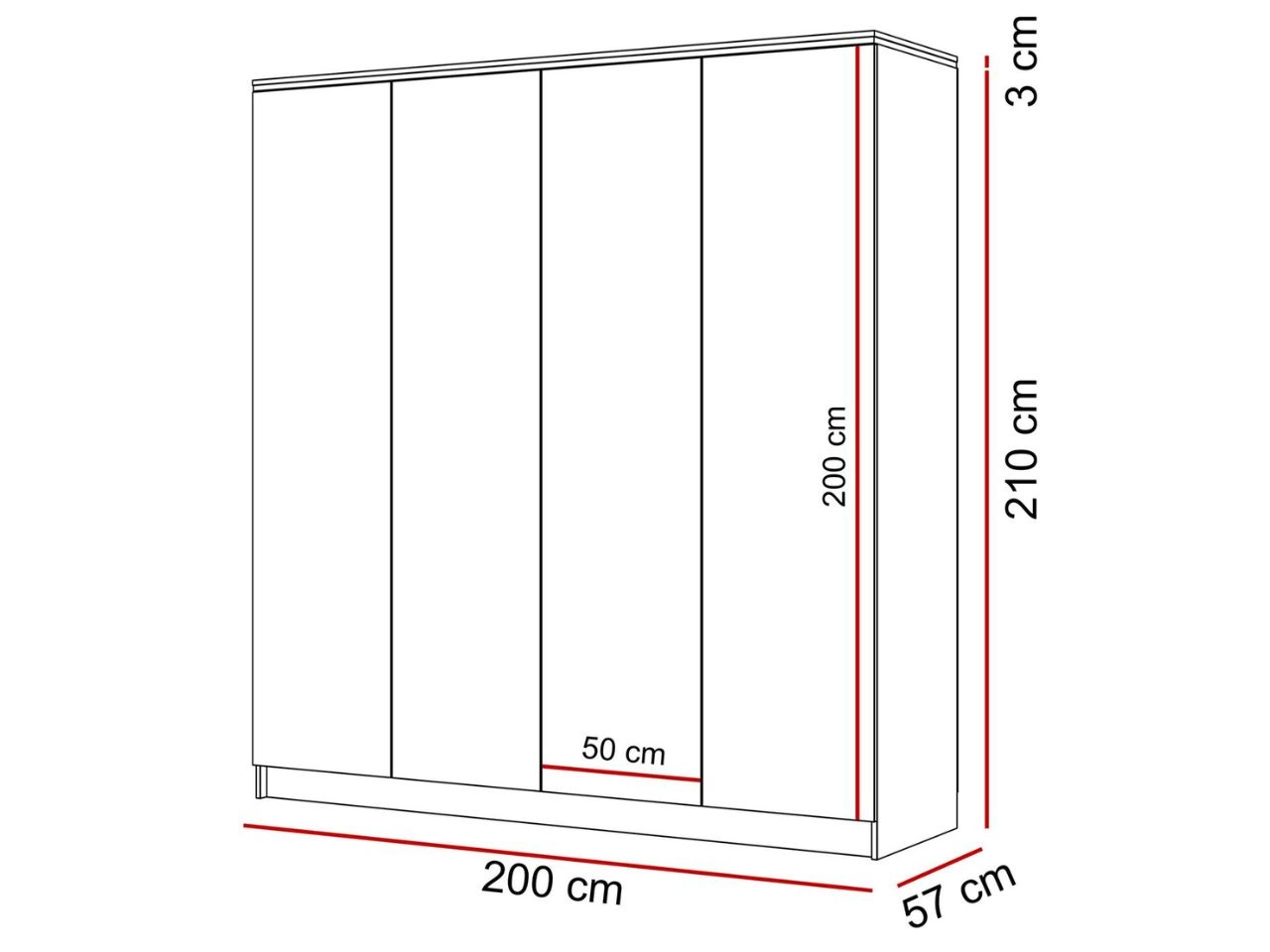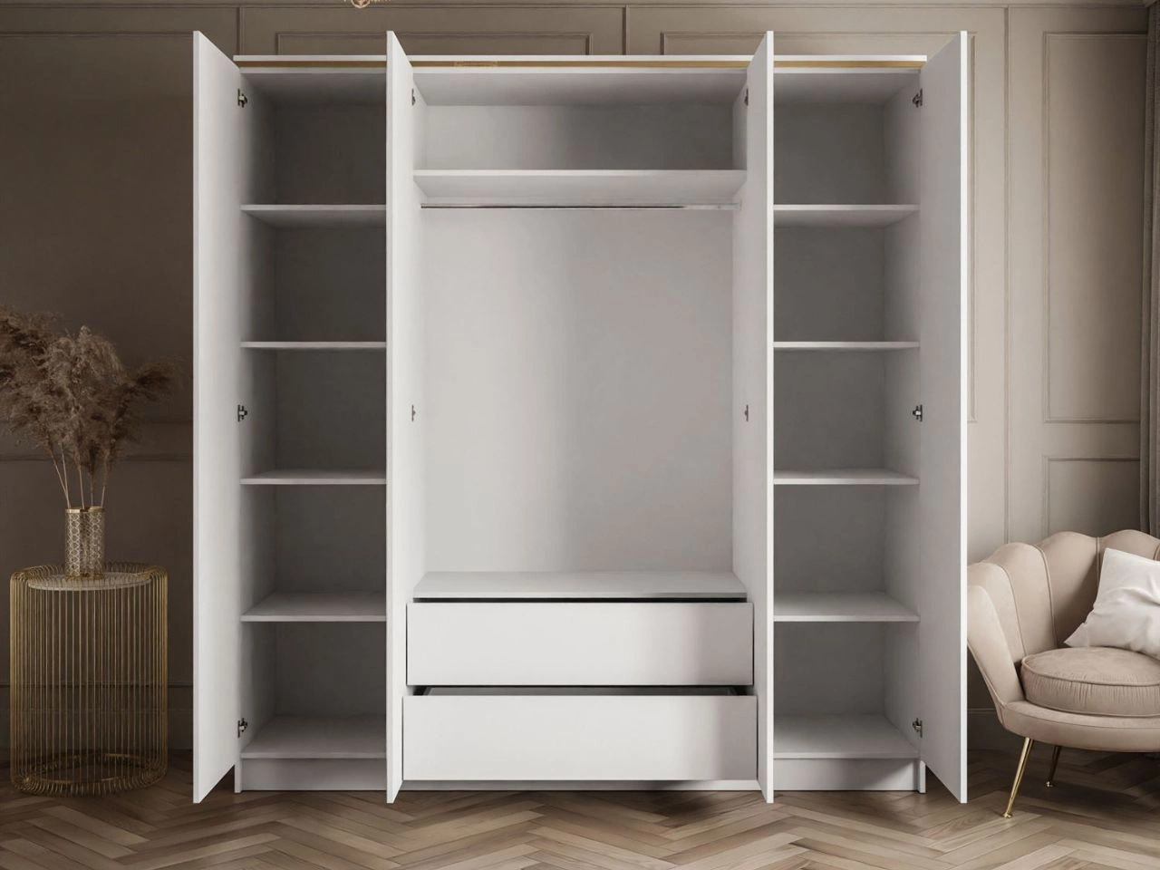 Ta czterodrzwiowa szafa oferuje przestrzeń niezbędną do przechowywania ubrań, dodatków i akcesoriów. Wewnątrz znajdują się 2 praktyczne szuflady, osadzone na kulkowych prowadnicach z pełnym wysuwem, co zapewnia wygodę użytkowania. Dziewięć przestronnych półek pozwala idealnie posegregować garderobę, a drążek na wieszaki w zestawie umożliwia komfortowe wieszanie odzieży. Praktyczne detale, takie jak system push-to-open, pozwalają otwierać fronty jednym lekkim naciśnięciem, eliminując potrzebę uchwytów i zachowując minimalistyczną linię mebla.