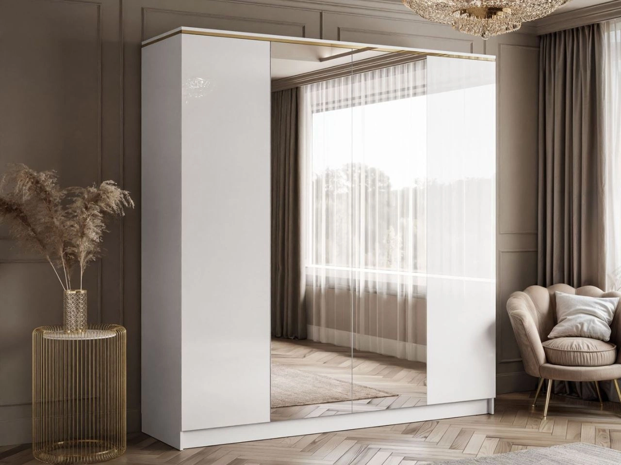 Szafa uchylna Evare w białym połysku to mebel, który łączy nowoczesny design z maksymalną funkcjonalnością, idealny do sypialni lub garderoby. Fronty w wysokim połysku w połączeniu z matowym korpusem tworzą efektowny kontrast, który dodaje wnętrzu lekkości i elegancji. Dekoracyjne obrzeże podkreśla ekskluzywny charakter mebla.