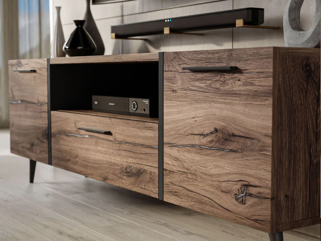 Szafka RTV Lunelie została zaprojektowana z myślą o nowoczesnym salonie. Wyposażona w dwie szafki boczne, szufladę oraz otwartą półkę na sprzęt multimedialny, oferuje sporo miejsca na akcesoria i urządzenia. To mebel, który harmonijnie łączy stylowy wygląd z wysoką praktycznością.