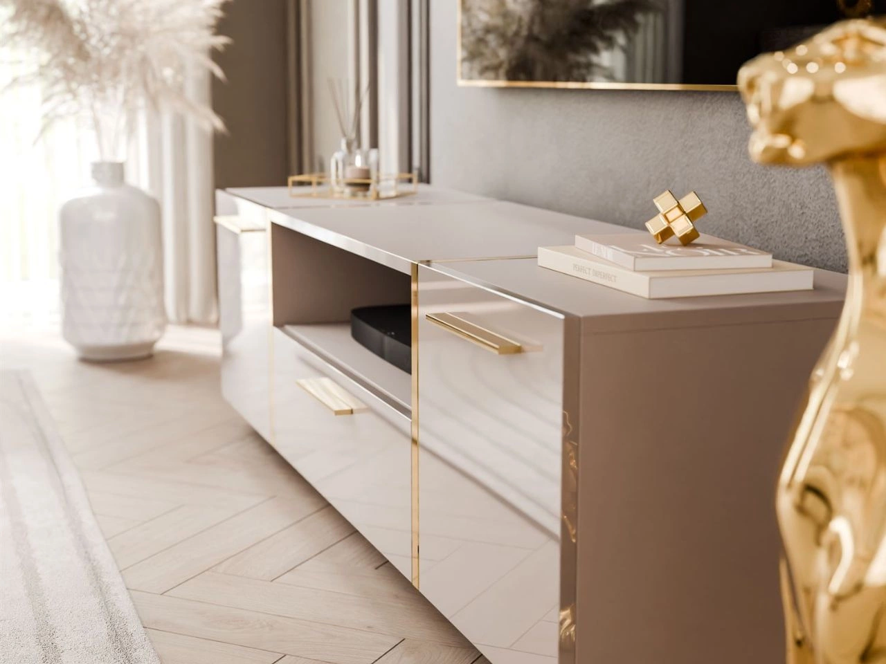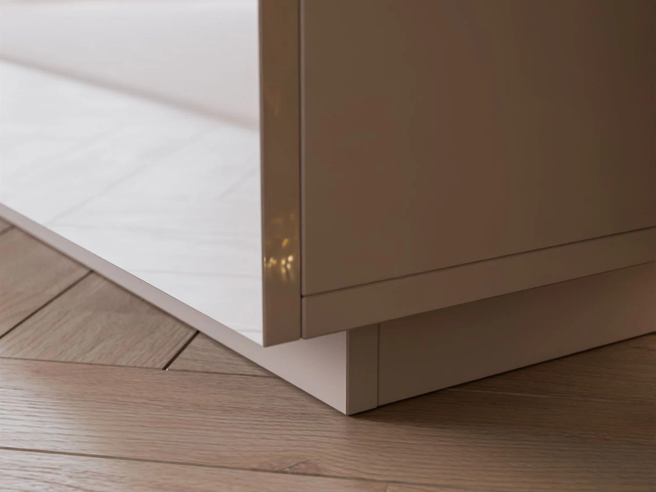 Cała kolekcja Lunelie została zaprojektowana z myślą o maksymalnej wygodzie użytkowania i estetyce. Stabilny cokół podkreśla solidność konstrukcji i nowoczesny charakter mebli, wprowadzając do wnętrza wrażenie spójności i elegancji. Fronty w wysokim połysku dodają szyku i rozjaśniają pomieszczenie, podkreślając ekskluzywny styl kolekcji. O wygodę dbają złote uchwyty oraz prowadnice kulkowe zapewniające płynne i ciche działanie szuflad. W efekcie powstał zestaw, który łączy nowoczesną formę, trwałość i codzienną funkcjonalność.