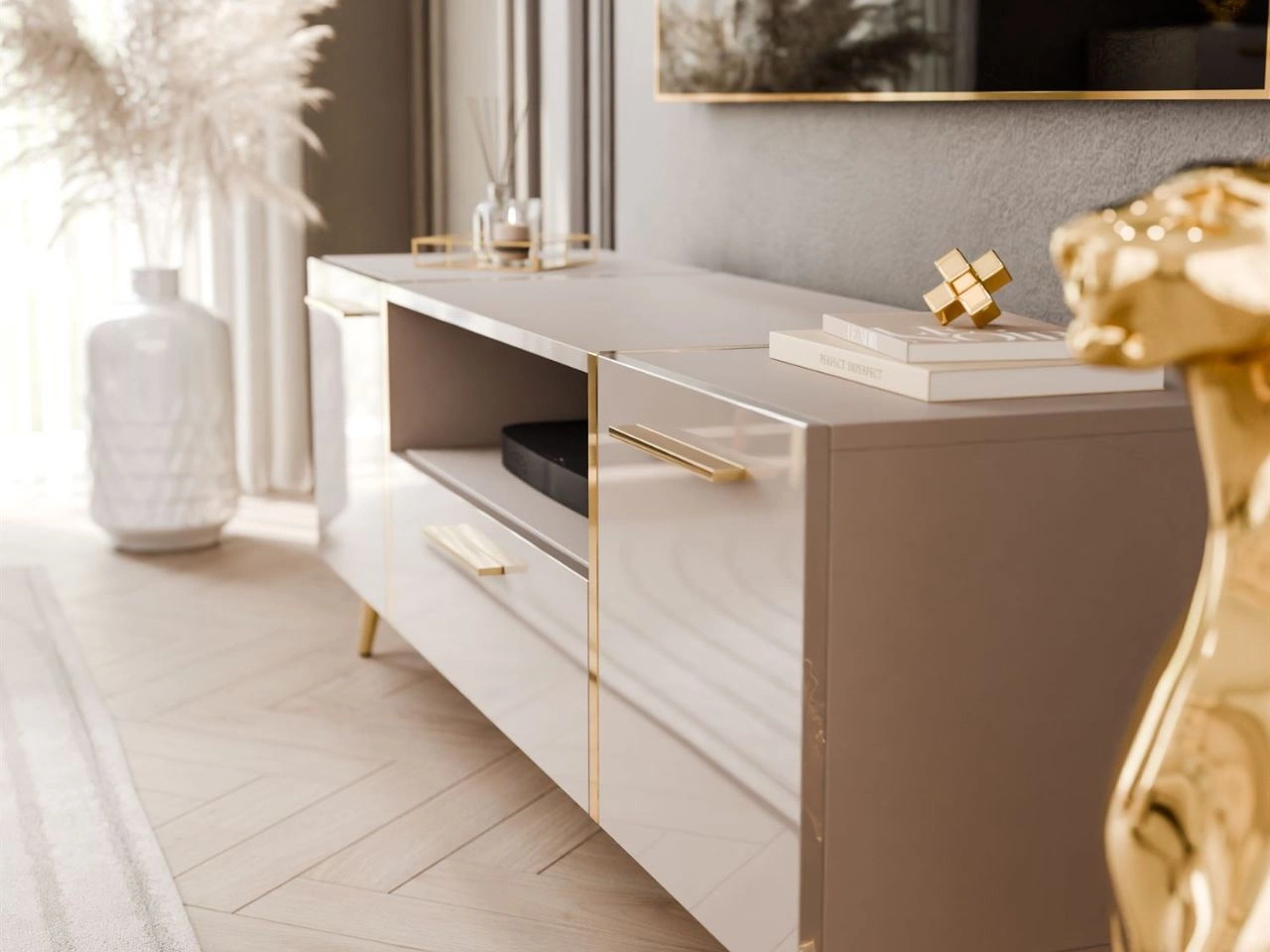 Cała kolekcja Lunelie została zaprojektowana z myślą o maksymalnej wygodzie użytkowania i estetyce. Smukłe, skośne nóżki nadają meblom lekkości i podkreślają nowoczesny design, jednocześnie optycznie powiększając przestrzeń. Fronty w wysokim połysku dodają szyku i rozjaśniają pomieszczenie, podkreślając ekskluzywny styl kolekcji. O wygodę O wygodę dbają złote uchwyty oraz prowadnice kulkowe zapewniające płynne i ciche działanie szuflad. W efekcie powstał zestaw, który łączy nowoczesną formę, trwałość i codzienną funkcjonalność.