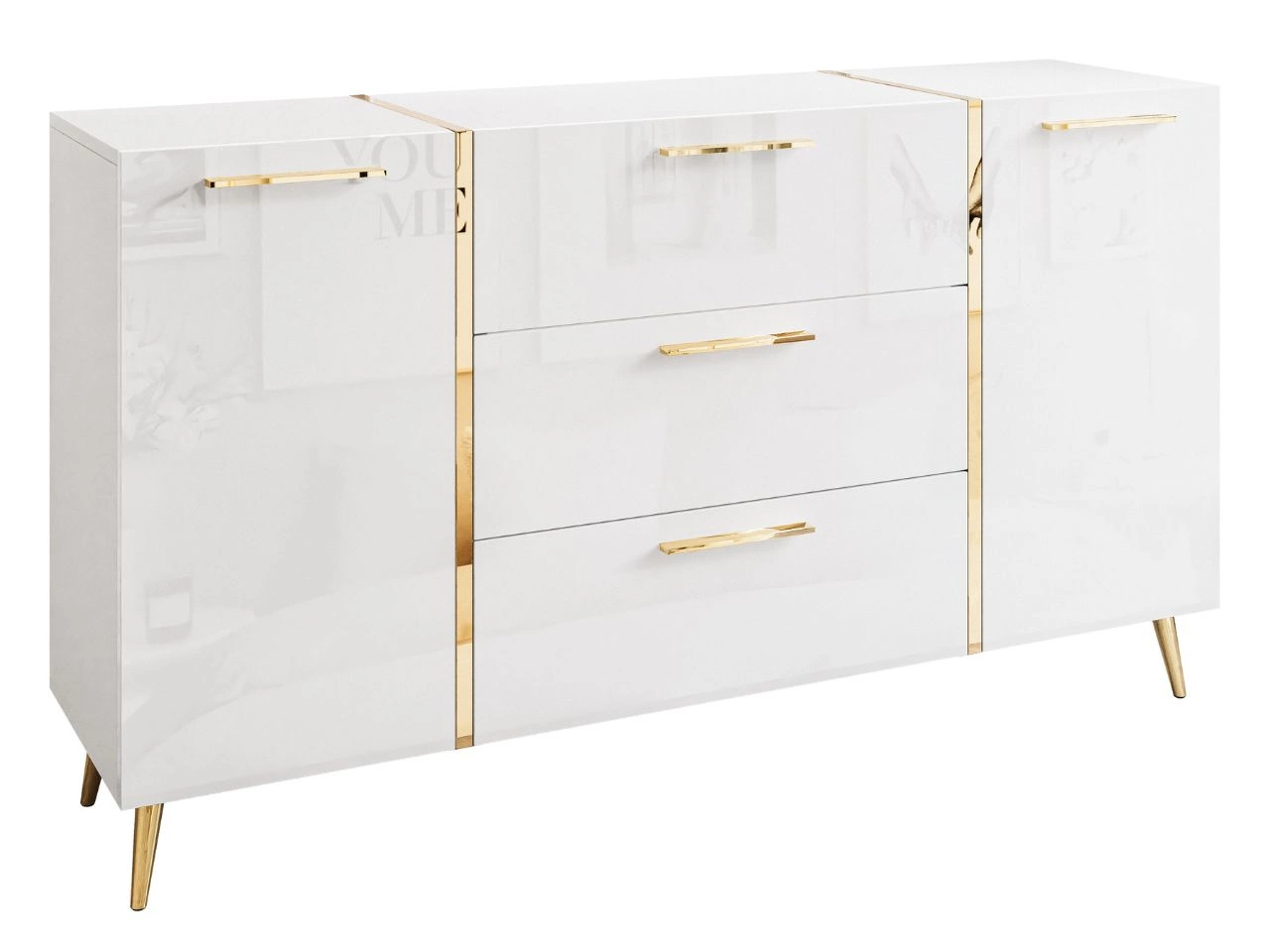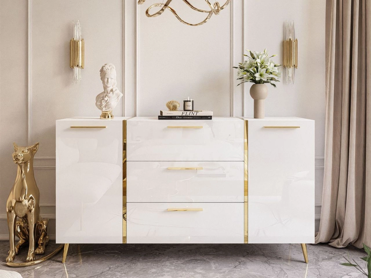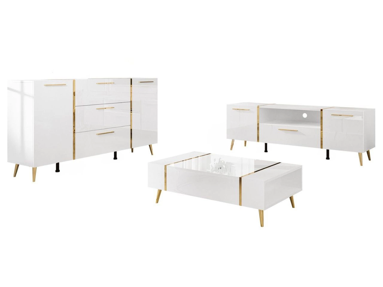 Zestaw mebli do salonu na złotych metalowych nóżkach i ze złotymi uchwytami Lunelie Biały połysk