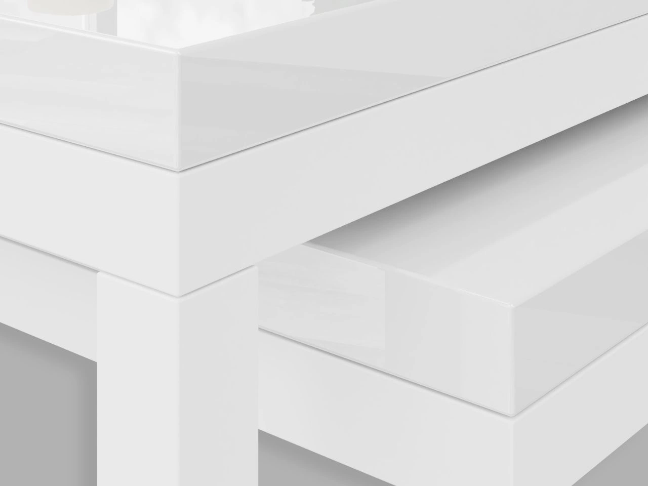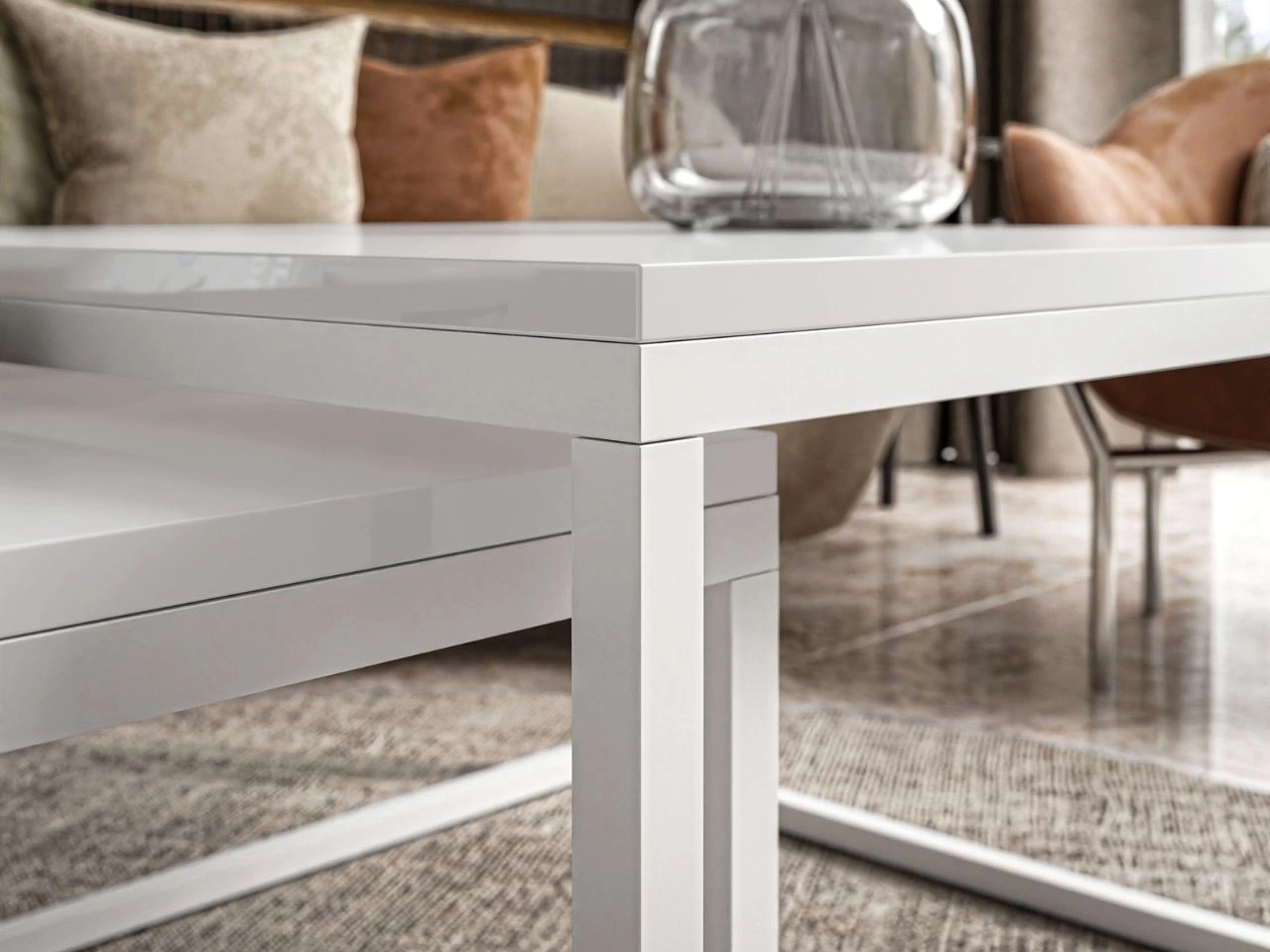 Blaty w połysku, wykonane z wysokiej jakości płyty laminowanej, zachwycają gładką, lśniącą powierzchnią, która pięknie odbija światło i optycznie rozświetla wnętrze. W połączeniu z białym, stalowym stelażem tworzą wyjątkowo nowoczesny, lekki i subtelny zestaw, który doskonale podkreśli charakter współczesnych aranżacji.