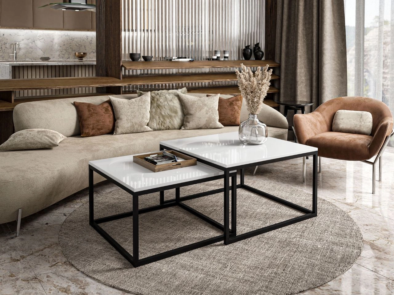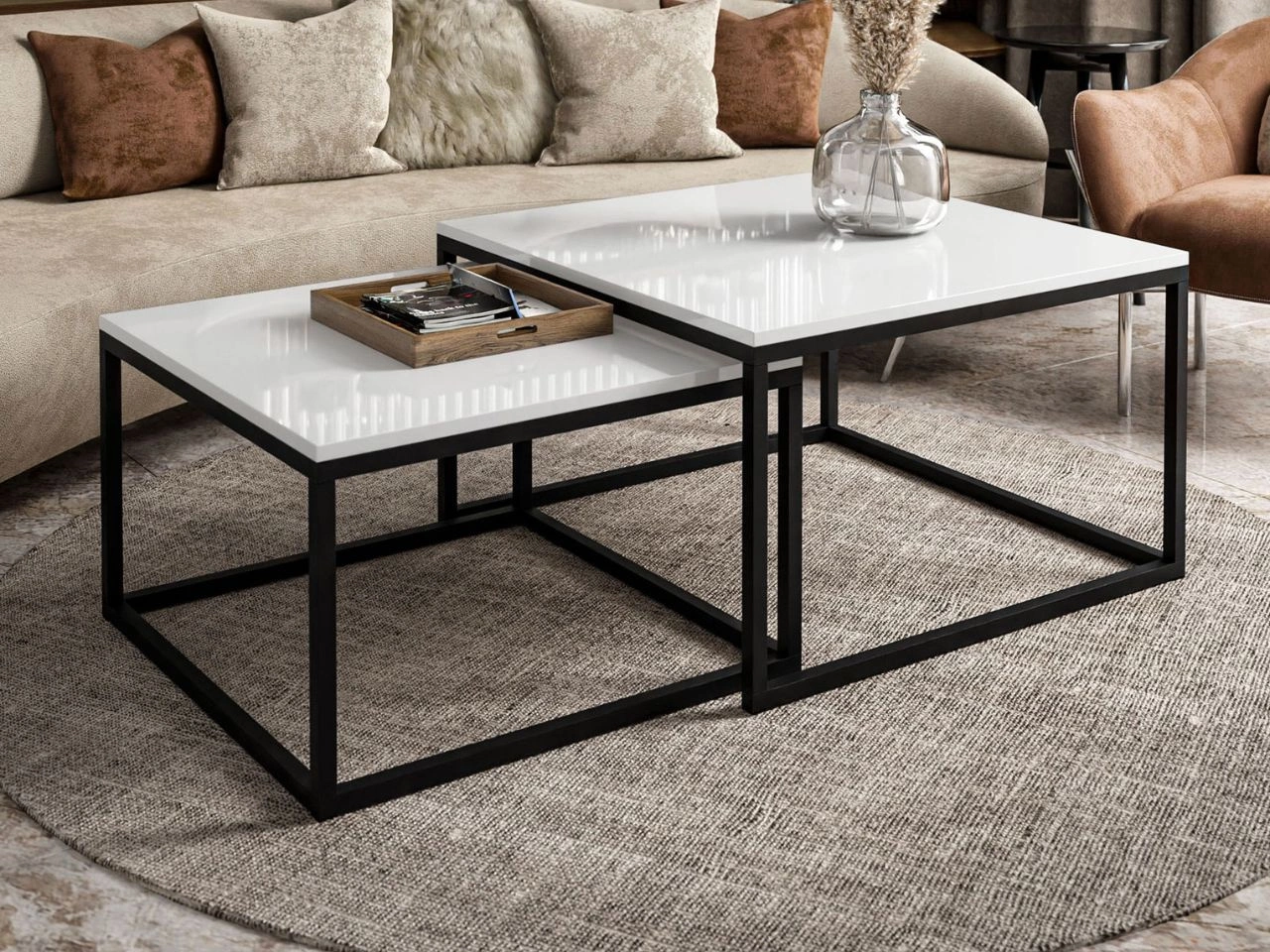 Zróżnicowane wymiary stolików pozwalają łatwo wsunąć mniejszy pod większy, dzięki czemu zestaw jest nie tylko efektowny, ale również niezwykle praktyczny. To rozwiązanie idealne zarówno do przestronnych salonów, jak i mniejszych pomieszczeń, w których liczy się funkcjonalność, estetyka i dbałość o każdy detal.