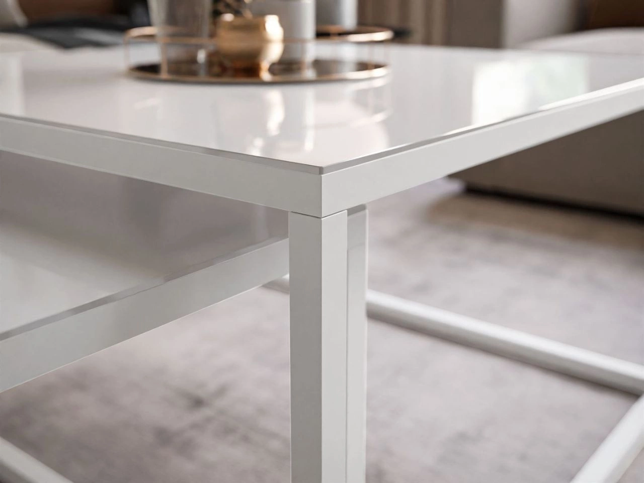 Blaty ze szkła hartowanego zachwycają gładką, połyskującą powierzchnią, która pięknie odbija światło, nadając wnętrzu lekkości i elegancji. W połączeniu z białym, stalowym stelażem tworzą nowoczesny, subtelny zestaw, doskonale komponujący się z aranżacjami w stylu nowoczesnym i glamour.