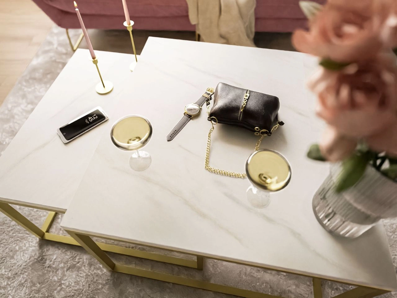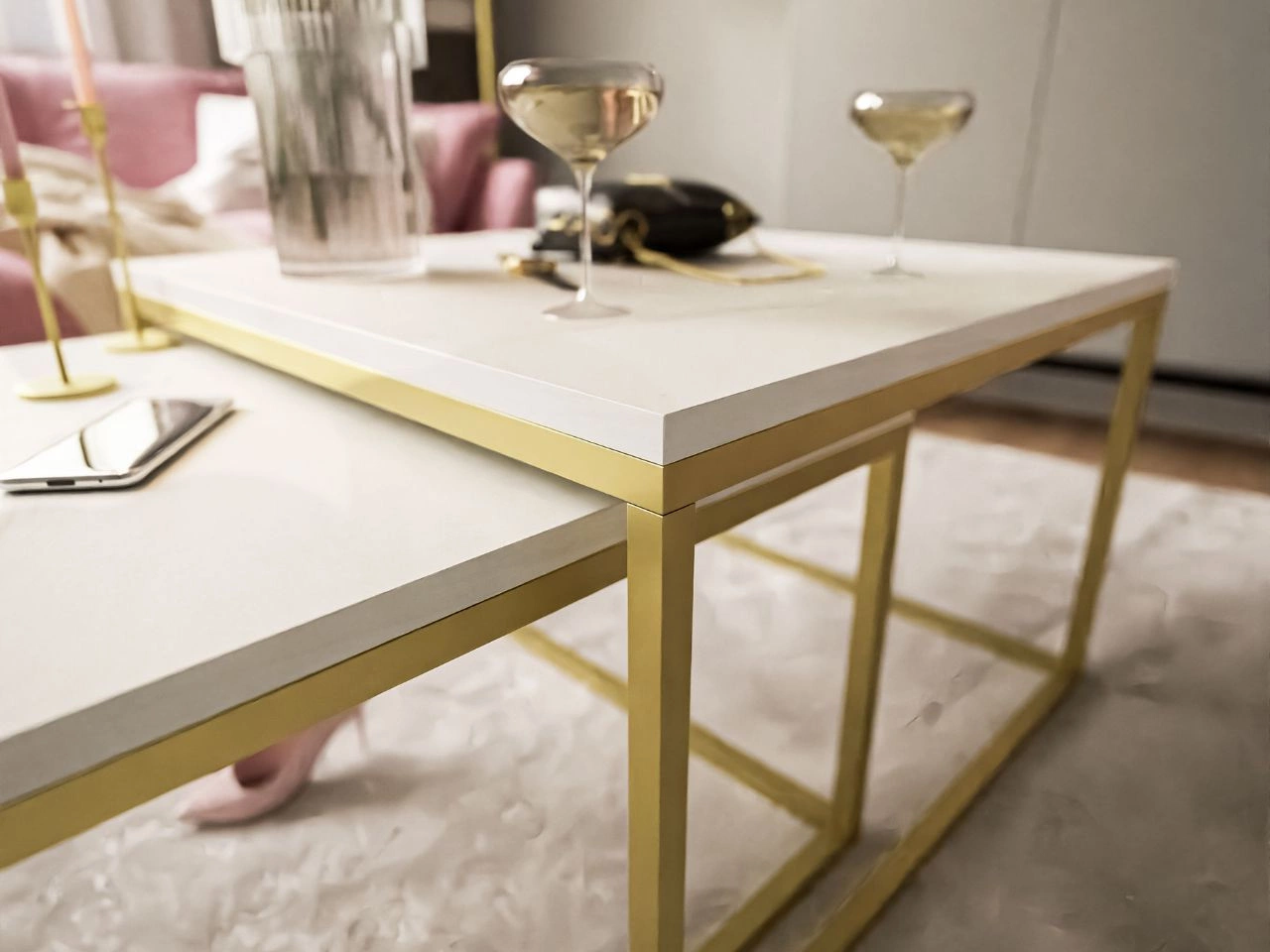Blat stolików kawowych wykonano z płyty laminowanej o grubości 16 mm, w eleganckim kolorze imitującym biały marmur, który wprowadza do wnętrza luksusowy i nowoczesny charakter. Stelaż stalowy, matowy, w złotym kolorze, malowany proszkowo, podkreśla wyrafinowany wygląd mebla i dodaje mu stabilności. Całość tworzy harmonijną kompozycję, łączącą elegancję z funkcjonalnością, idealną do nowoczesnych i glamour wnętrz.