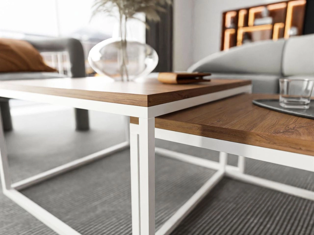 Różnorodność wymiarów stolików pozwala na wygodne wsunięcie mniejszego pod większy, co oszczędza miejsce i ułatwia aranżację przestrzeni. Takie rozwiązanie jest praktyczne zarówno w dużych salonach, jak i w mniejszych pokojach, gdzie liczy się funkcjonalność, porządek i estetyczny detal.