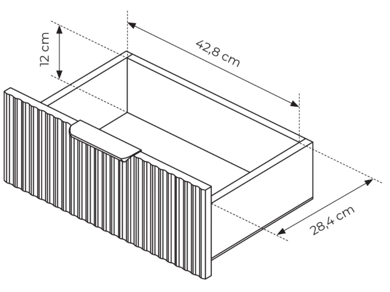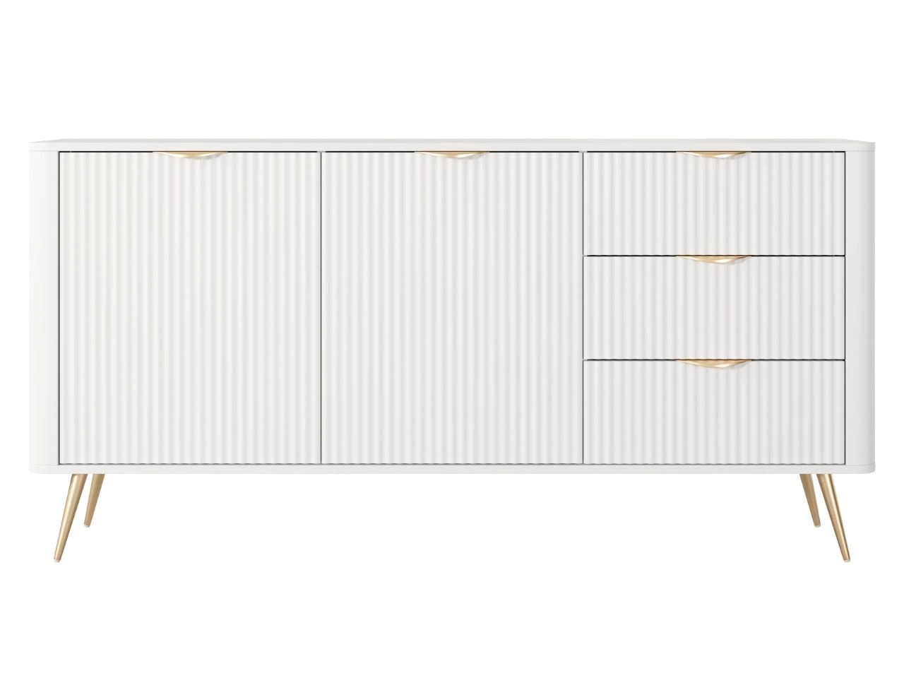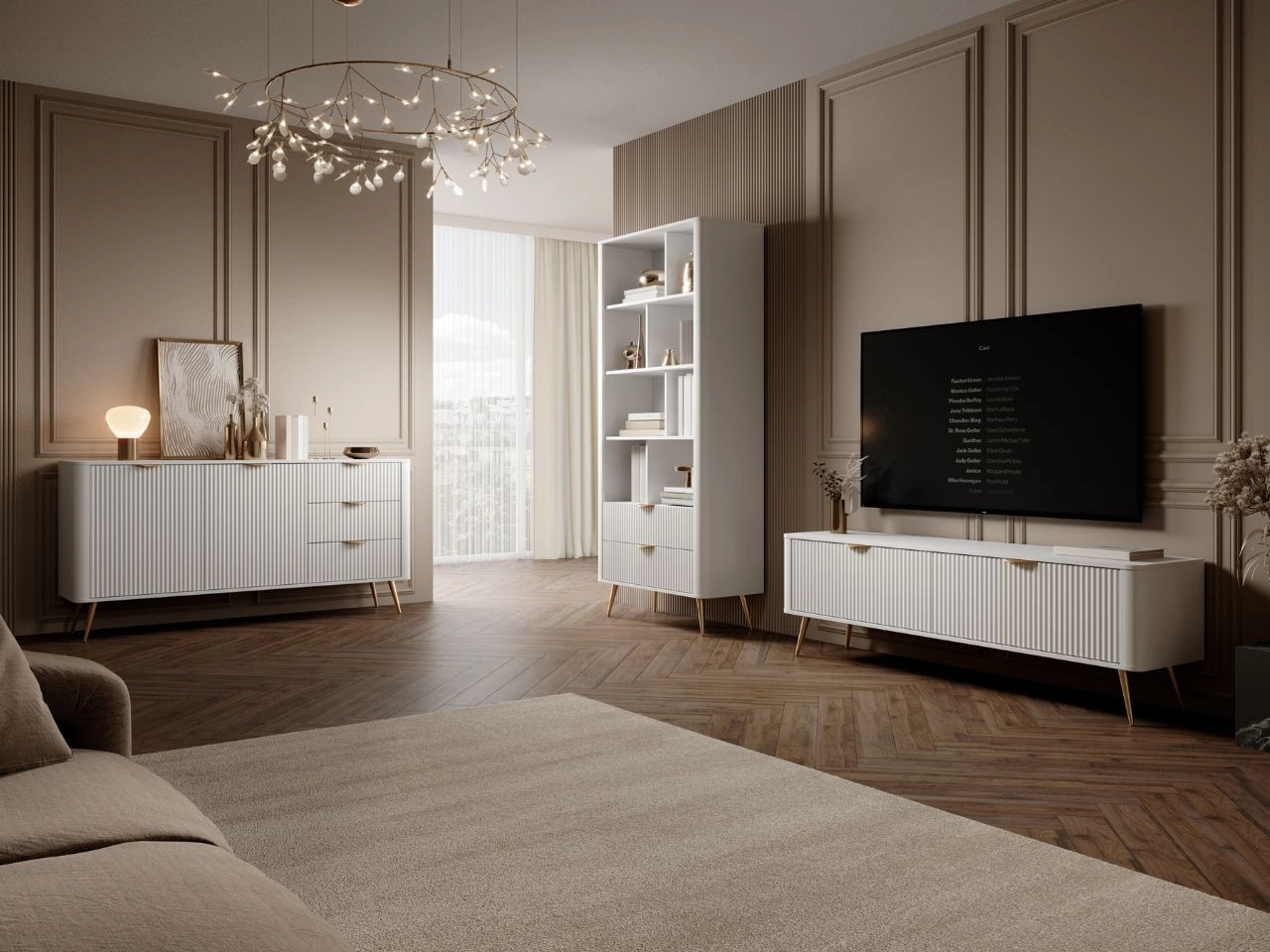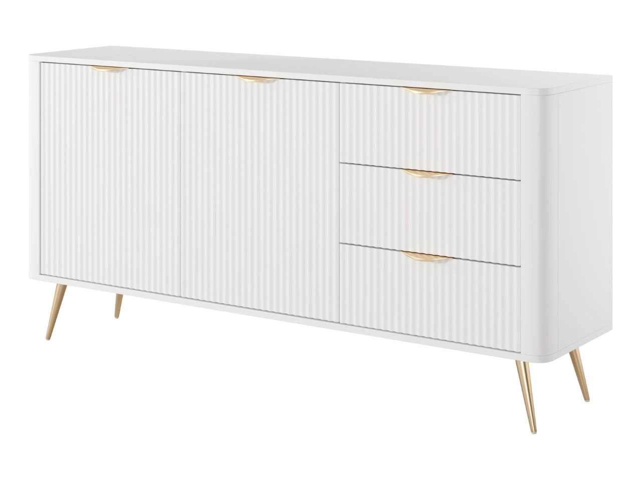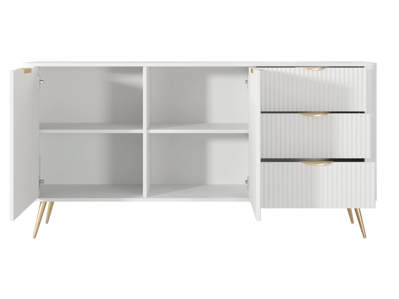 Charakterystycznym elementem komody Latina są jej ryflowane fronty. Została w nie wyposażona każda z dwóch szafek oraz trzech szuflad. Za łatwy dostęp do wnętrza szuflad odpowiadają złote uchwyty, oraz prowadnice kulkowe, oferujące pełny wysuw podczas otwierania. Złote uchwyty dostrzeżemy również na drzwiczkach szafek. Wzrok przyciągają ponadto metalowe nóżki w złotym kolorze. Nóżki zostały nachylone w taki sposób, aby komoda nabrała lekkości wizualnej.