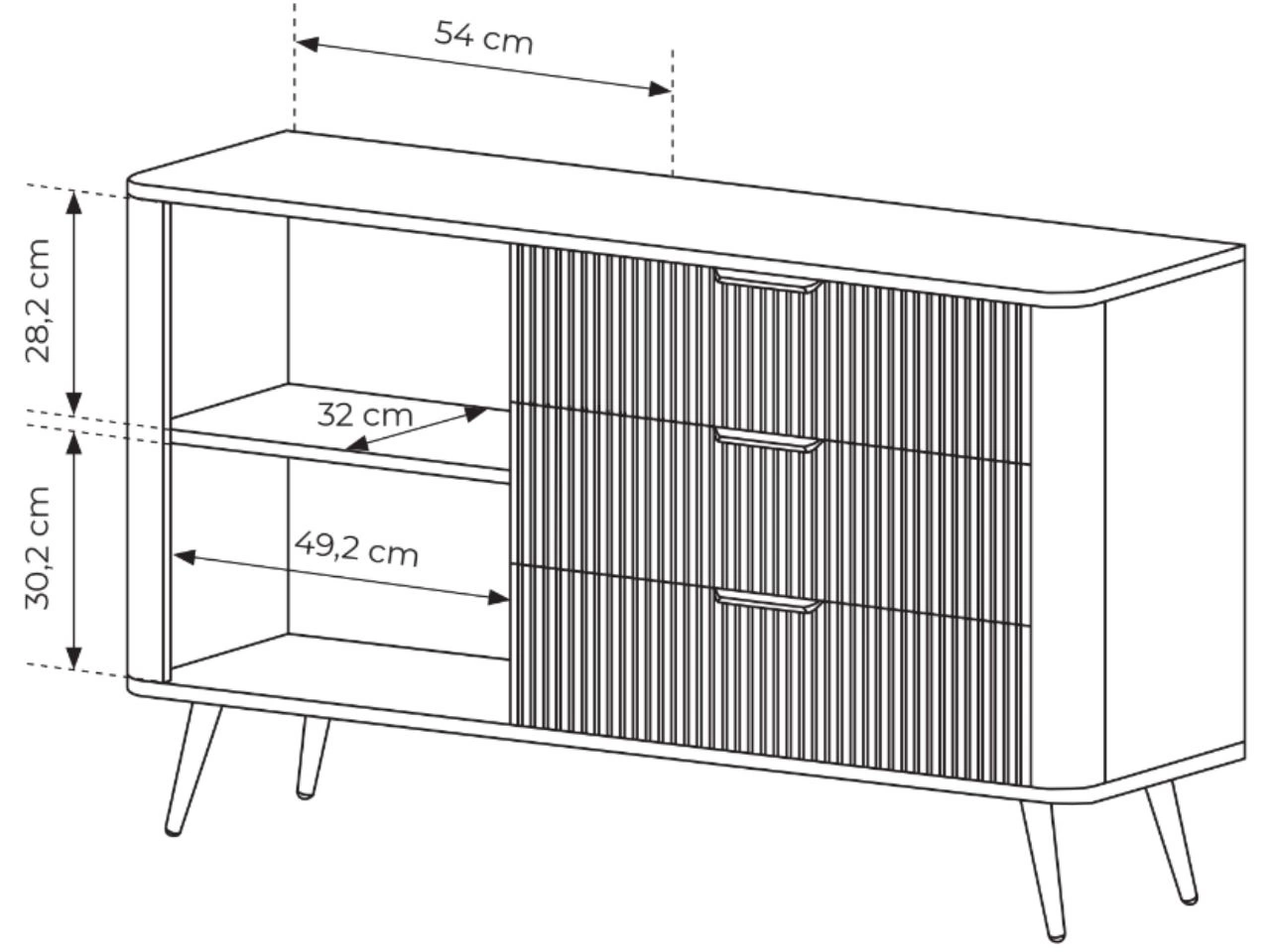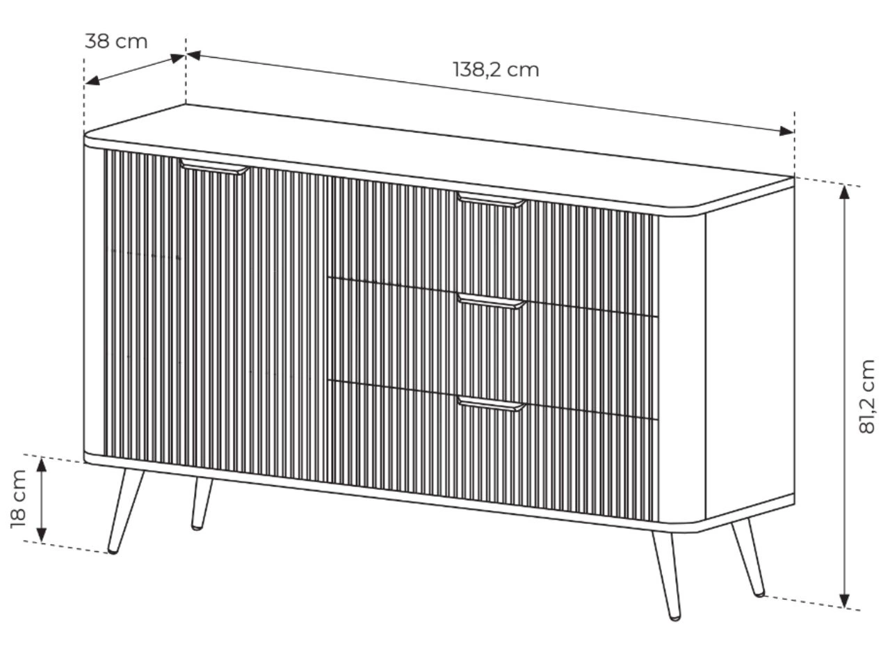 Zarówno fronty, jak i korpus wykonane zostały z wysokiej klasy płyty laminowanej, której obrzeża zabezpieczono dodatkowo okleiną ABS. Zabieg ten ma na celu ochronę przed powstawaniem drobnych uszkodzeń mechanicznych oraz zarysowań. Uniemożliwia również przenikanie wilgoci do wnętrza płyty. Warto również zwrócić uwagę na zaokrąglone rogi komody, które nadają całości swoistego efektu retro.