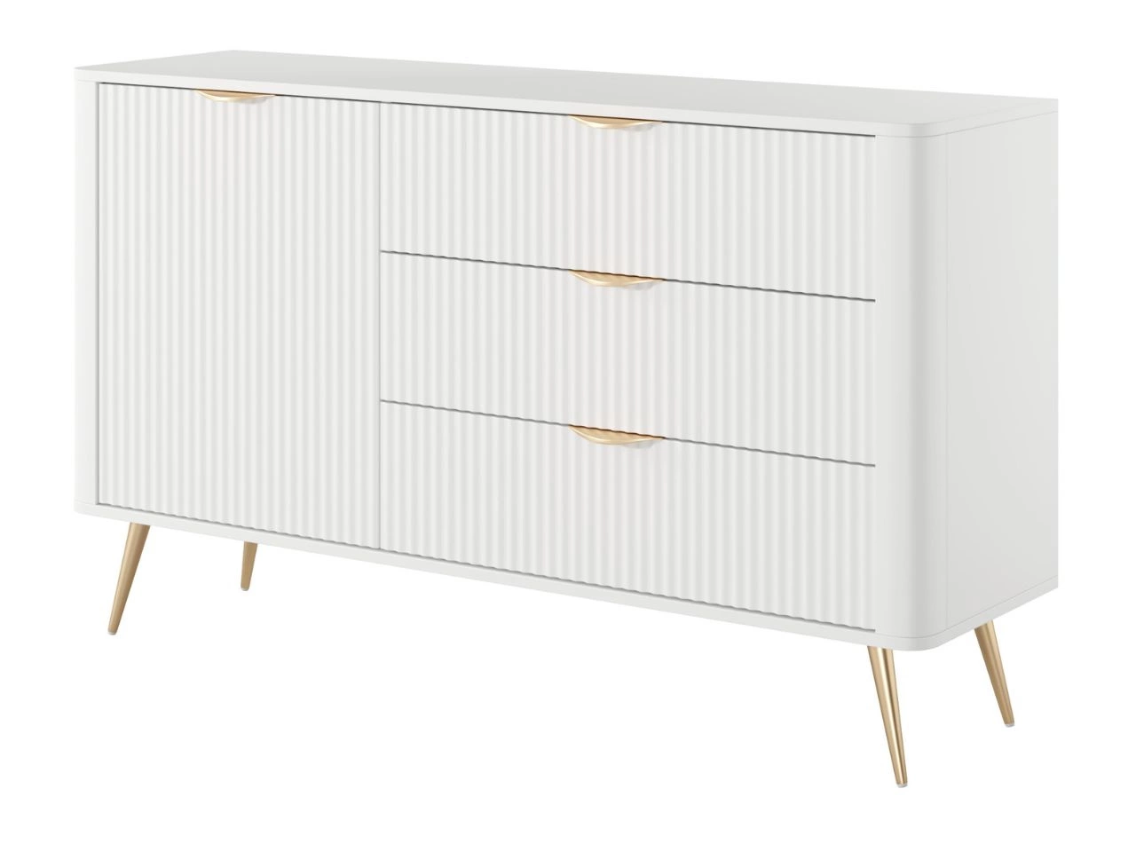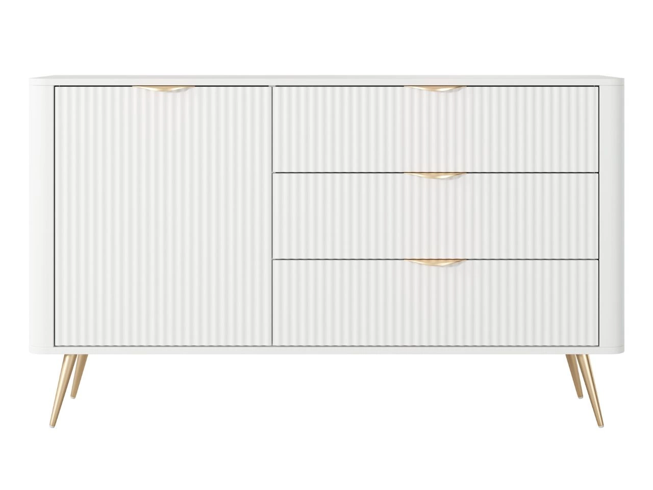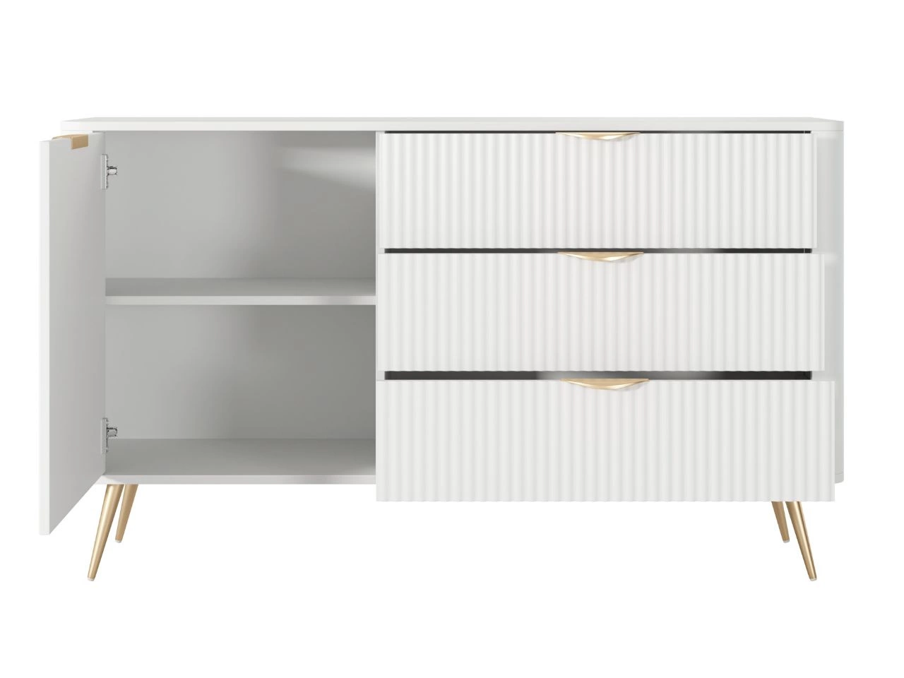 Charakterystycznym elementem komody Latina są jej ryflowane fronty. Została w nie wyposażona zarówno szafka, jak i trzy szuflady. Za łatwy dostęp do wnętrza szuflad odpowiadają złote uchwyty, oraz prowadnice kulkowe, oferujące pełny wysuw podczas otwierania. Złoty uchwyt dostrzeżemy również na drzwiczkach szafki. Wzrok przyciągają ponadto metalowe nóżki w złotym kolorze. Nóżki zostały nachylone w taki sposób, aby komoda nabrała lekkości wizualnej.