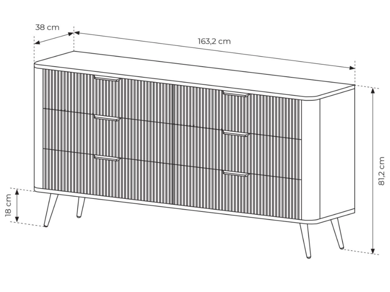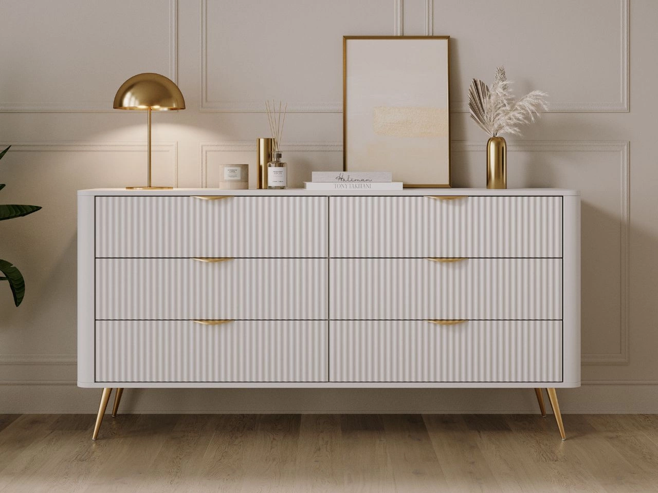 Wszystkie elementy zestawu Latina posiadają oczywiście wiele cech wspólnych, takich jak ryflowane fronty, zaokrąglone rogi oraz złote uchwyty oraz nóżki. Te dwa ostatnie elementy wykonano z metalu, co jest dodatkowym smaczkiem stylistycznym i przypadnie do gustu szczególnie miłośnikom stylistyki glamour.