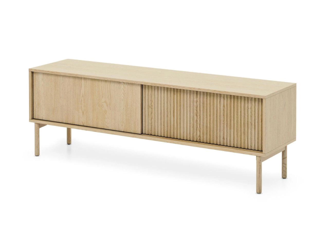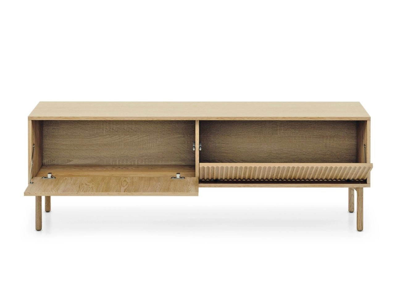 Wnętrze szafki oferuje dużo przestrzeni do przechowywania — po jednej stronie znajduje się klasyczna klapa otwierana w dół, a po drugiej front z charakterystycznym ryflowaniem. Oba przedziały zapewniają wygodne miejsce na sprzęt RTV, akcesoria lub inne domowe drobiazgi. Tylną część szafki wykonano z płyty HDF w dekorze dąb Sonoma, dzięki czemu mebel prezentuje się estetycznie i spójnie również od środka. Całość stabilnie wspiera się na drewnianych nogach, które dodają lekkości i wdzięku nowoczesnej formie.