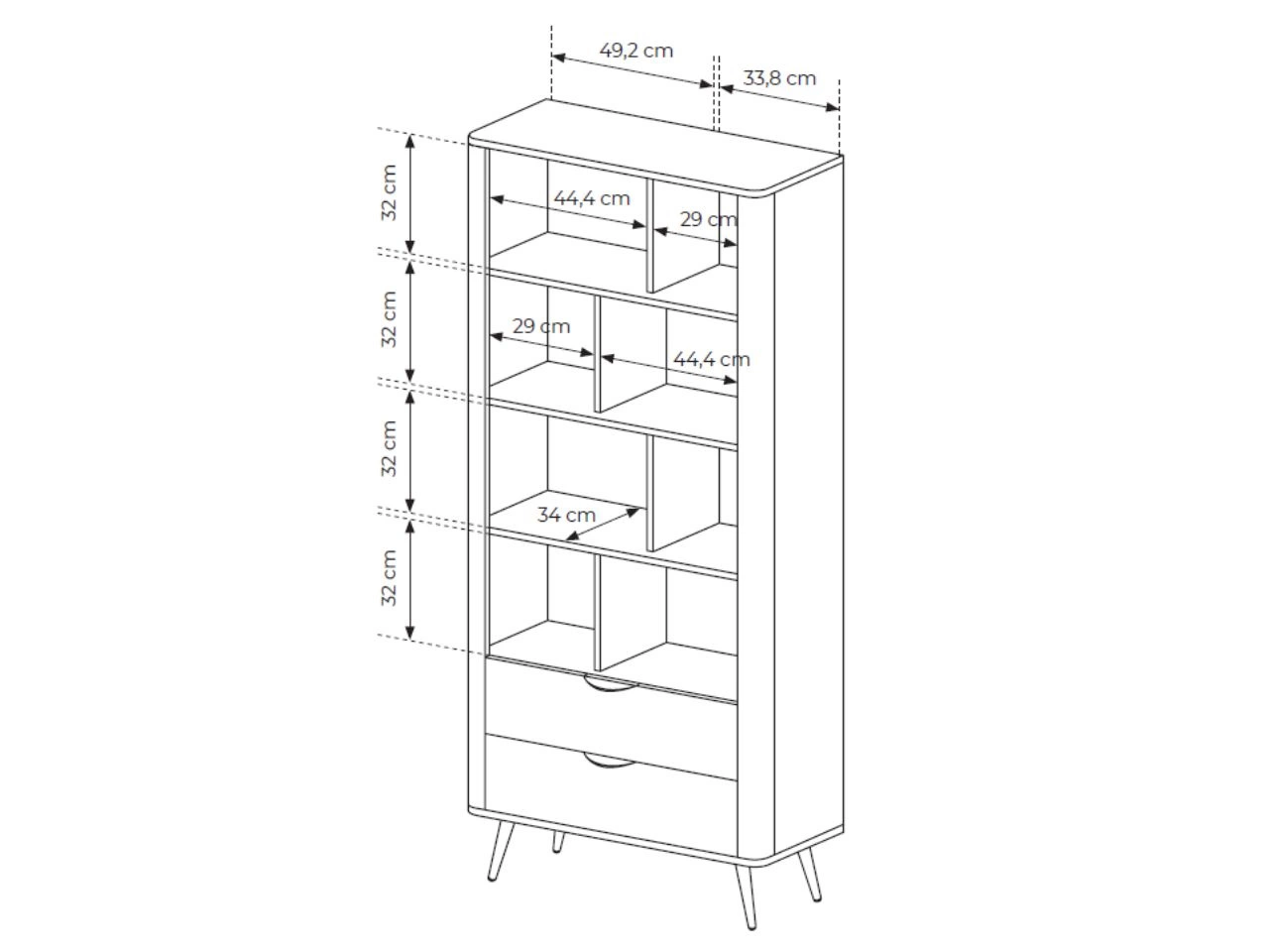 W dolnej części regału umieszczono dwie pojemne szuflady, idealne do przechowywania drobiazgów i akcesoriów. Zastosowane prowadnice kulkowe z pełnym wysuwem gwarantują wygodny i precyzyjny dostęp do zawartości, a wnętrze wykonane z płyty HDF w kolorze dopasowanym do dąb dunin zapewnia spójną estetykę także od wewnątrz. Stabilne metalowe nogi nadają meblowi lekkości oraz nowoczesnego wyrazu, a subtelne uchwyty podkreślają spójną, elegancką stylistykę kolekcji.