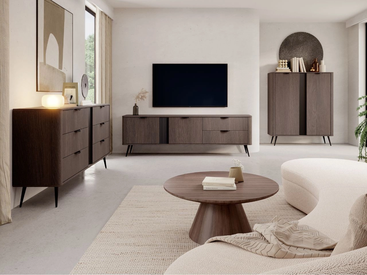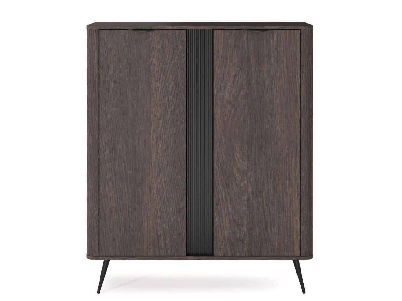 Komoda stoi na czarnych metalowych nogach, dzięki czemu prezentuje się lekko i nowocześnie, a jednocześnie zachowuje doskonałą stabilność. Subtelnie wyprofilowane uchwyty w kolorze czarnym podkreślają nowoczesny charakter kolekcji i dopełniają spójnej estetyki.