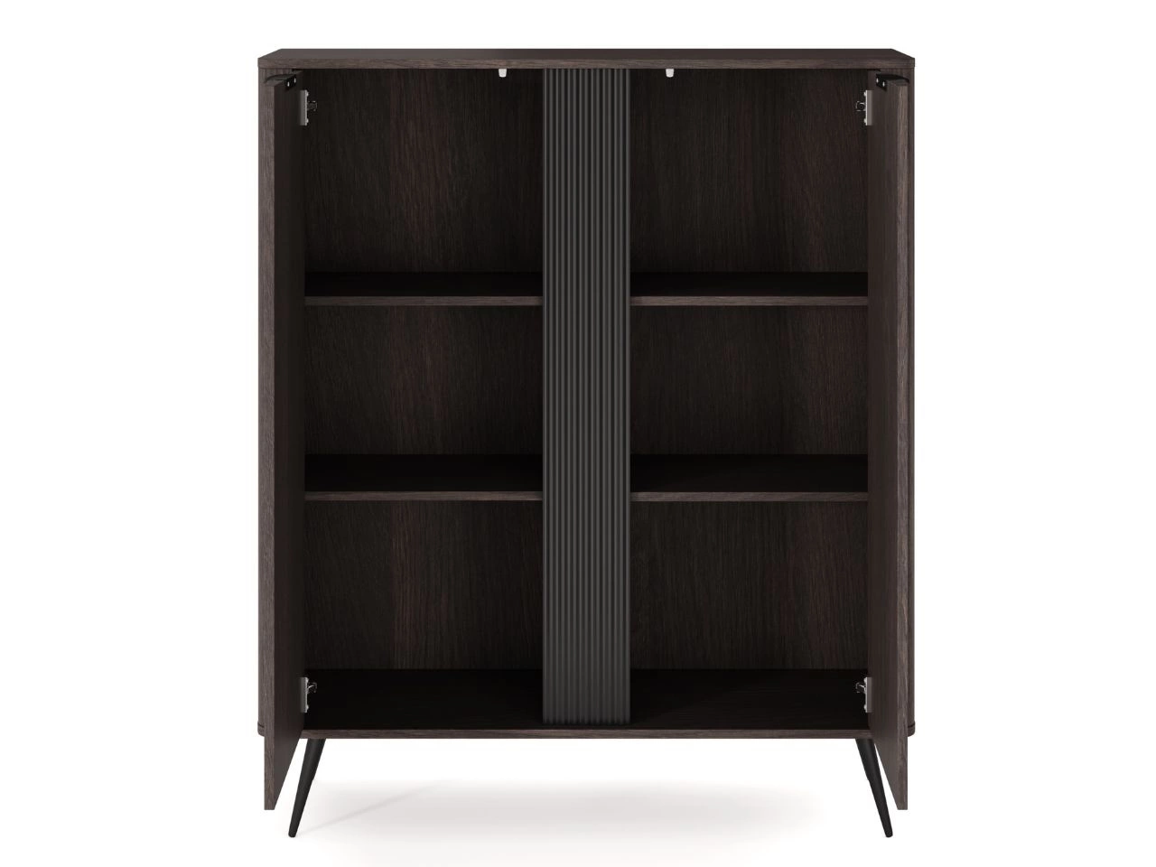 Fronty i korpus wykonano z laminowanej płyty wiórowej, wykończonej trwałym obrzeżem ABS, które zwiększa odporność na codzienne użytkowanie. Charakterystycznym elementem tej komody jest ryflowany panel MDF umieszczony centralnie, nadający całości unikatowego, designerskiego wyrazu.