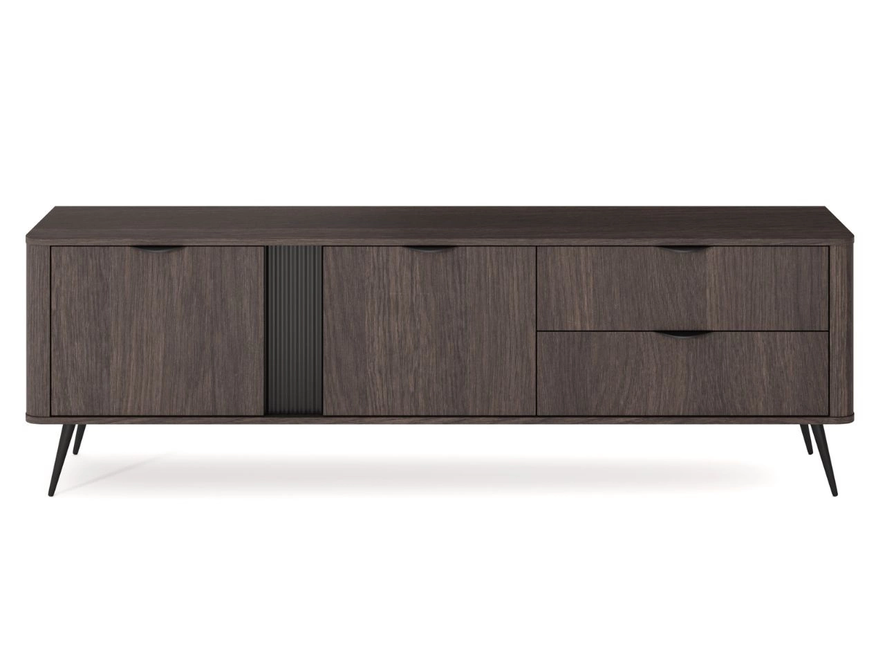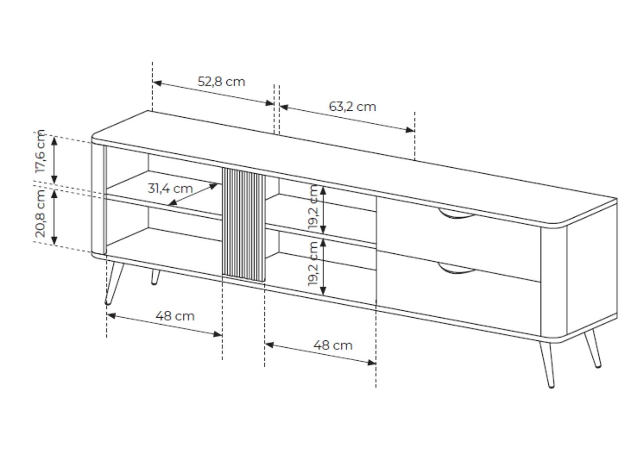 Wnętrze szafki RTV zaprojektowano z myślą o wygodnym przechowywaniu sprzętu i akcesoriów. Po lewej stronie znajdują się dwie pojemne szafki z praktycznymi półkami, które bez trudu mieszczą dekodery, routery, konsole czy akcesoria RTV. Po prawej stronie umieszczono dwie funkcjonalne szuflady, idealne do przechowywania drobnych przedmiotów, kabli czy dokumentów. Szuflady poruszają się na prowadnicach kulkowych z pełnym wysuwem, co zapewnia płynne działanie i łatwy dostęp do całej przestrzeni.