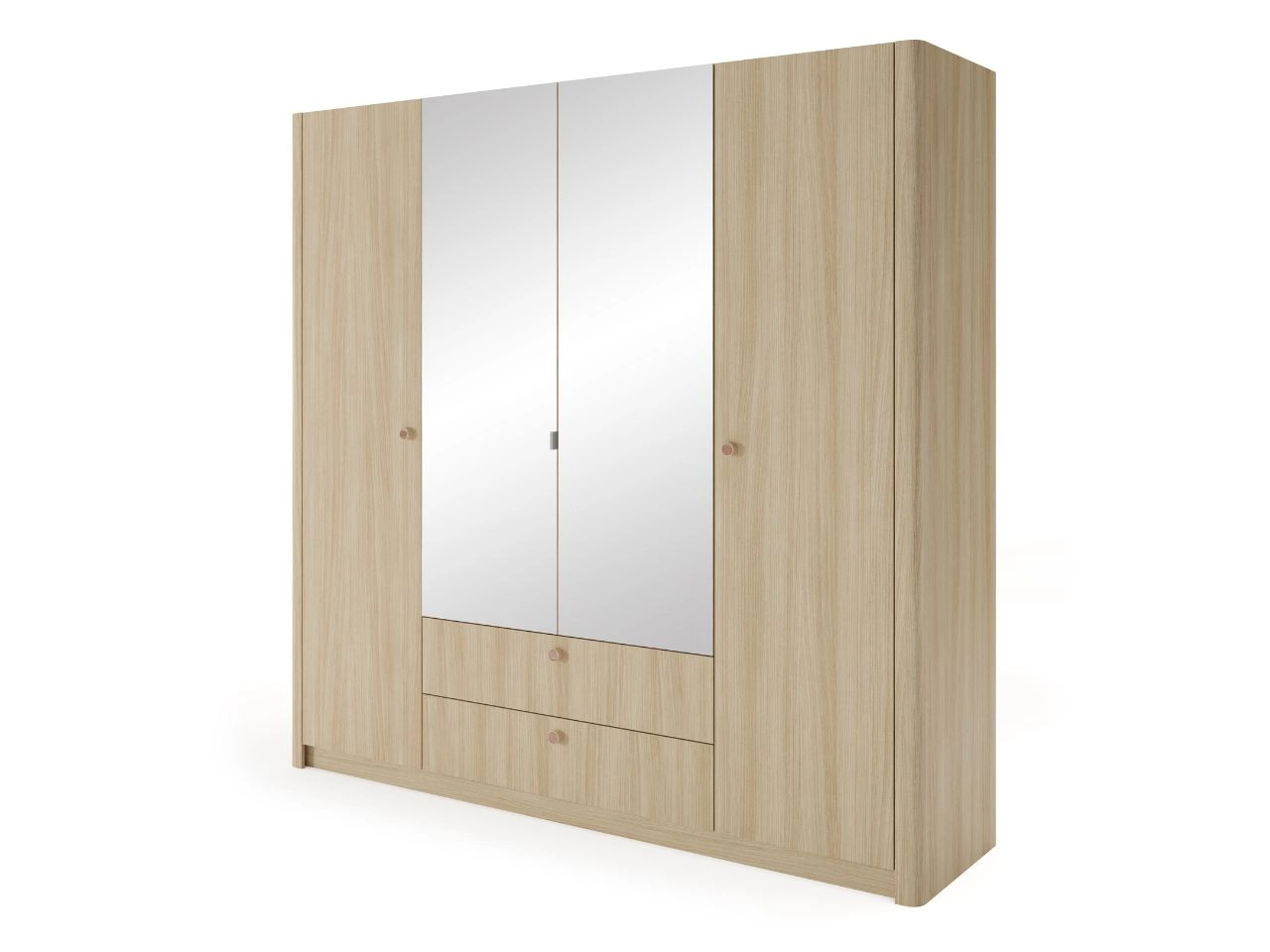 Korpus i fronty powstały z laminowanej płyty wiórowej wykończonej trwałym obrzeżem ABS w odcieniu dopasowanym do całości. Charakter mebla podkreślają drewniane uchwyty z mocca aplikacją, wprowadzające subtelny, naturalny akcent. Centralnie umieszczone lustra zwiększają praktyczność szafy, jednocześnie rozświetlając wnętrze i nadając mu wrażenie większej przestrzeni.