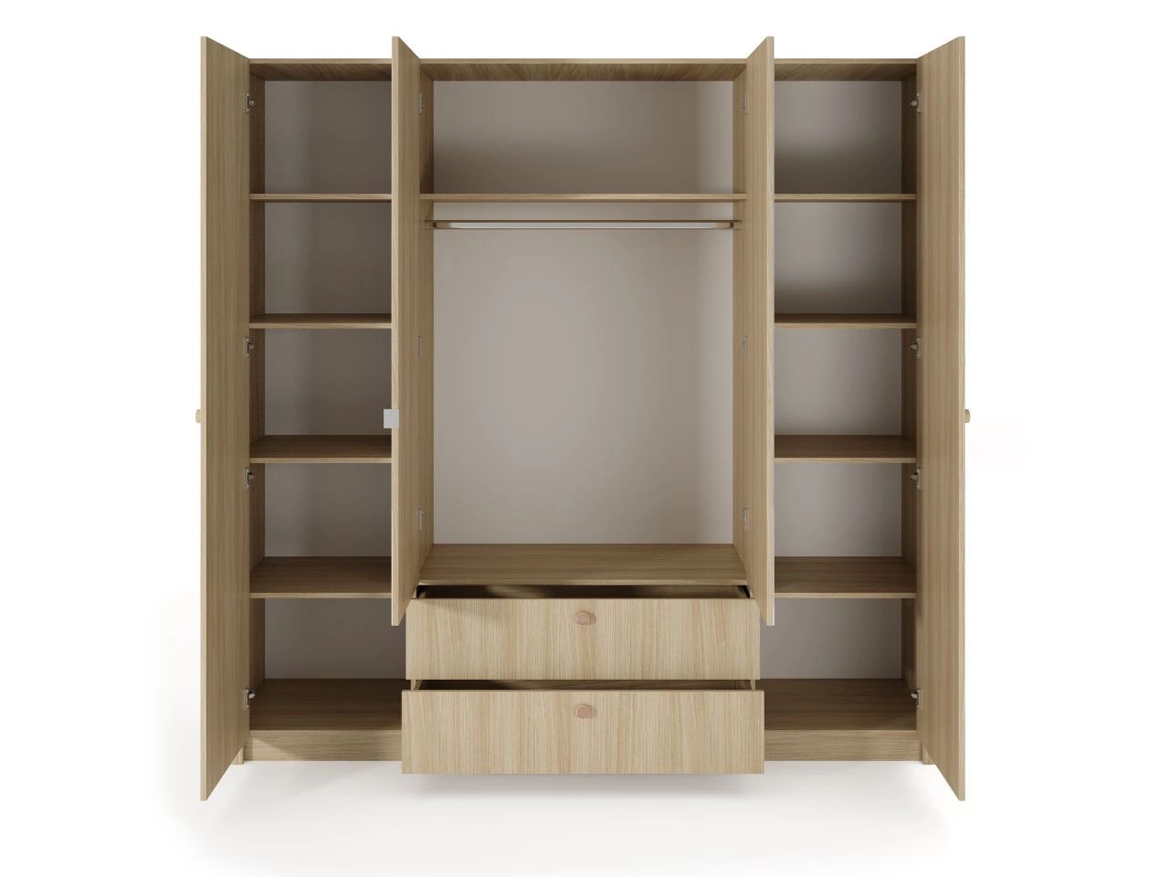 Przemyślane wnętrze szafy Bilancio zapewnia maksymalną wygodę użytkowania — pojemne półki pozwalają na uporządkowane przechowywanie odzieży i tekstyliów, a szeroka przestrzeń z drążkiem ułatwia przechowywanie ubrań wiszących. Dwie dolne szuflady wyposażono w prowadnice kulkowe z pełnym wysuwem, dzięki którym działają płynnie, stabilnie i umożliwiają wygodny dostęp do całej zawartości.