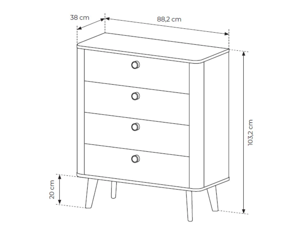 Największym atutem komody są cztery praktyczne szuflady, które zapewniają wyjątkowo komfortową organizację przechowywania. Osadzone na prowadnicach kulkowych z pełnym wysuwem, wysuwają się lekko i stabilnie, umożliwiając łatwy dostęp do całej zawartości — idealne na bieliznę, ubrania, akcesoria czy domowe drobiazgi.