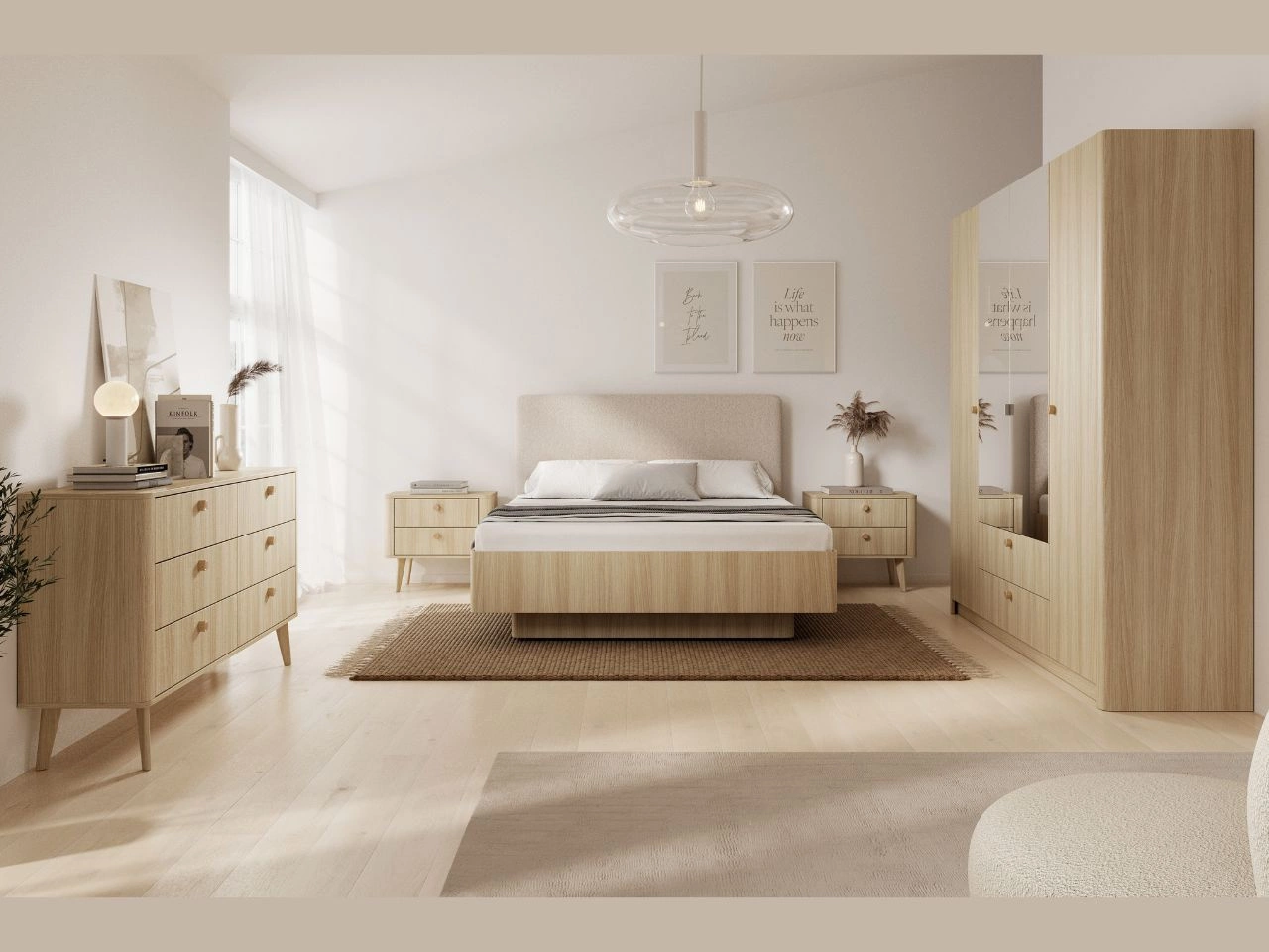 Szeroki korpus wykonano z laminowanej płyty wiórowej wykończonej trwałym obrzeżem ABS w kolorze płyty, dzięki czemu mebel jest odporny na codzienne użytkowanie i zachowuje estetykę przez lata. Delikatne drewniane uchwyty z aplikacją mocca wprowadzają subtelny akcent dekoracyjny, który dopełnia jej naturalny charakter.