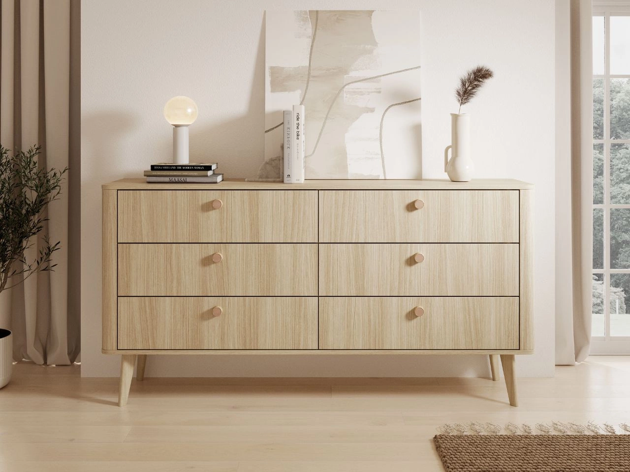 Komoda wyposażona jest w sześć pojemnych szuflad, co daje wyjątkowo dużą przestrzeń do przechowywania ubrań, tekstyliów, dokumentów czy domowych akcesoriów. Każdą z nich osadzono na prowadnicach kulkowych z pełnym wysuwem, gwarantujących płynne działanie, stabilność i wygodny dostęp do całej zawartości.