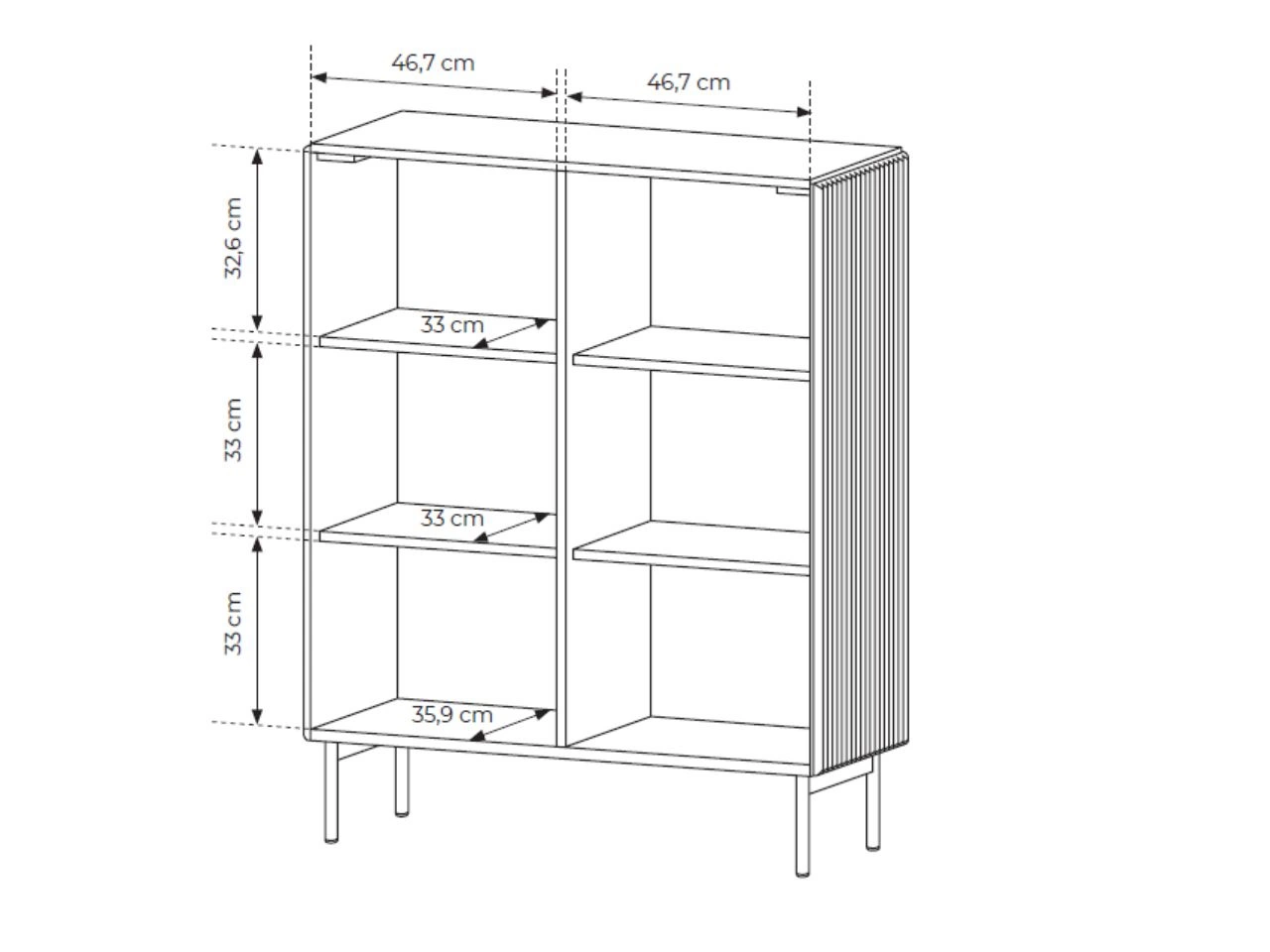 Fronty, wykonane w tej samej ryflowanej strukturze co korpus, nadają szafce spójną i elegancką formę. Mebel wyposażony jest w jedną parę drzwi, które otwierają się lekko i stabilnie dzięki solidnym zawiasom, zapewniając wygodny dostęp do wszystkich półek. Pełne, zabudowane fronty skutecznie chronią przechowywane przedmioty przed kurzem, a ich staranne wykończenie podkreśla nowoczesny, pionowy charakter szafki. Wykorzystanie płyty HDF na tylnej części wzmacnia całą bryłę i gwarantuje estetyczne, jednolite wykończenie wewnątrz mebla.
