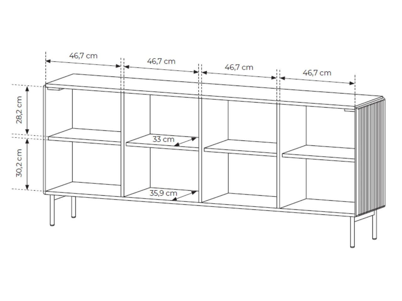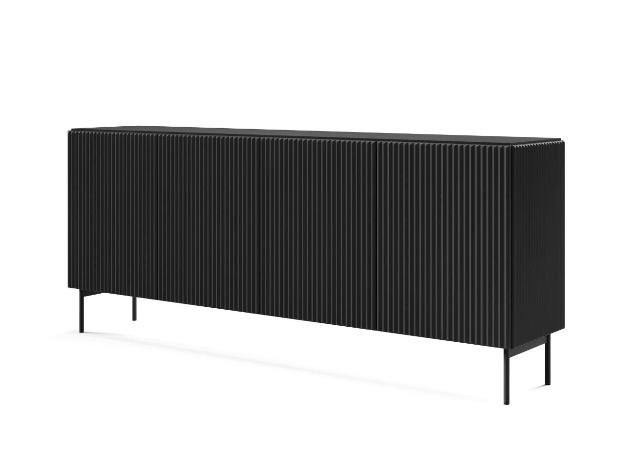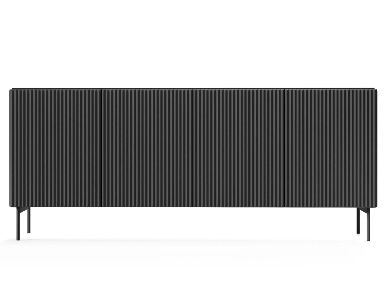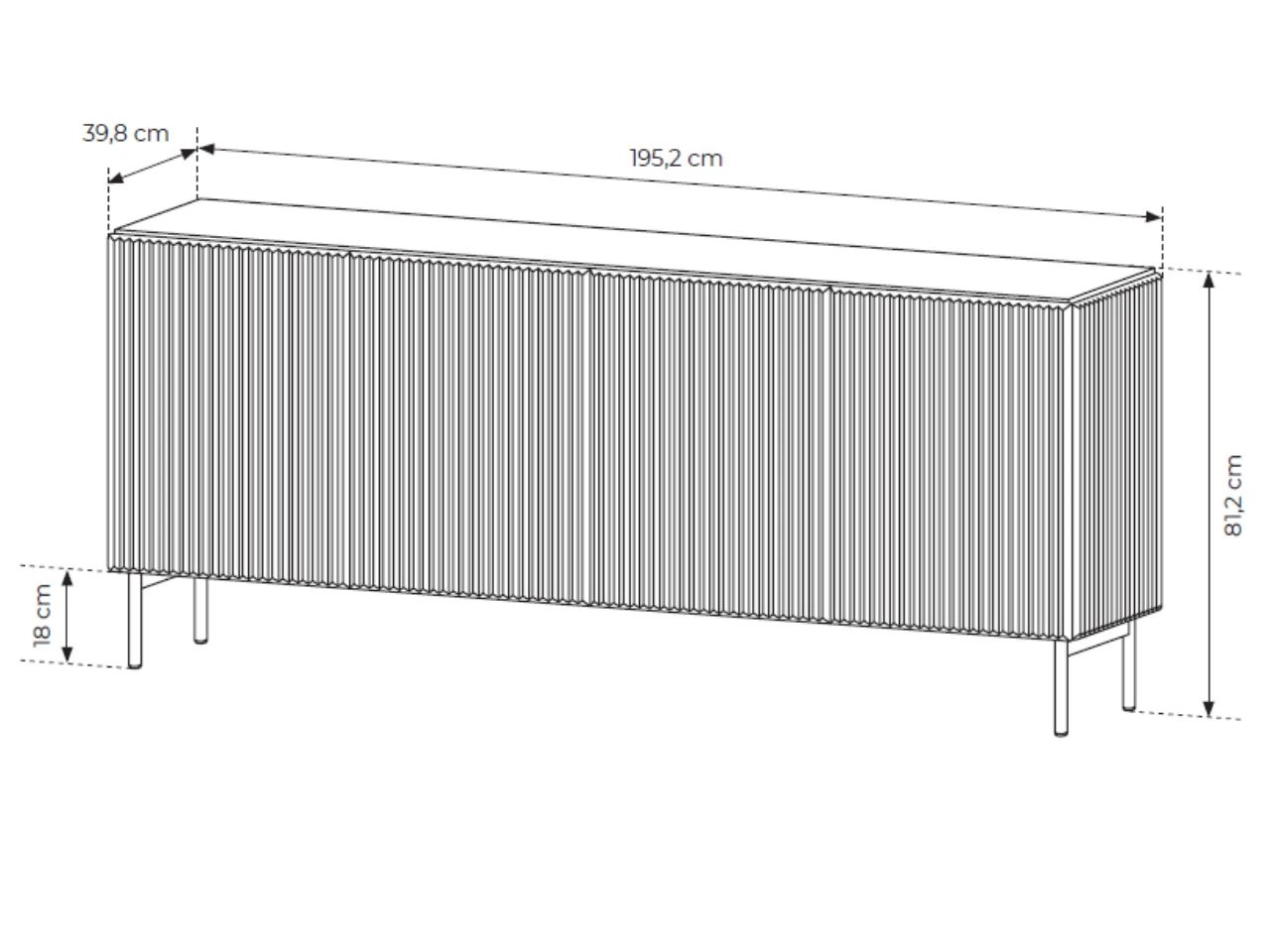 Fronty wykonano w identycznej, ryflowanej strukturze jak korpus, dzięki czemu całość prezentuje się jednolicie i nowocześnie. Komoda wyposażona jest w cztery zamykane szafki, które oferują praktyczną i dobrze zorganizowaną przestrzeń do przechowywania. Tylna ściana została wzmocniona płytą HDF, co dodatkowo usztywnia konstrukcję oraz gwarantuje schludne i spójne wykończenie wnętrza mebla.
