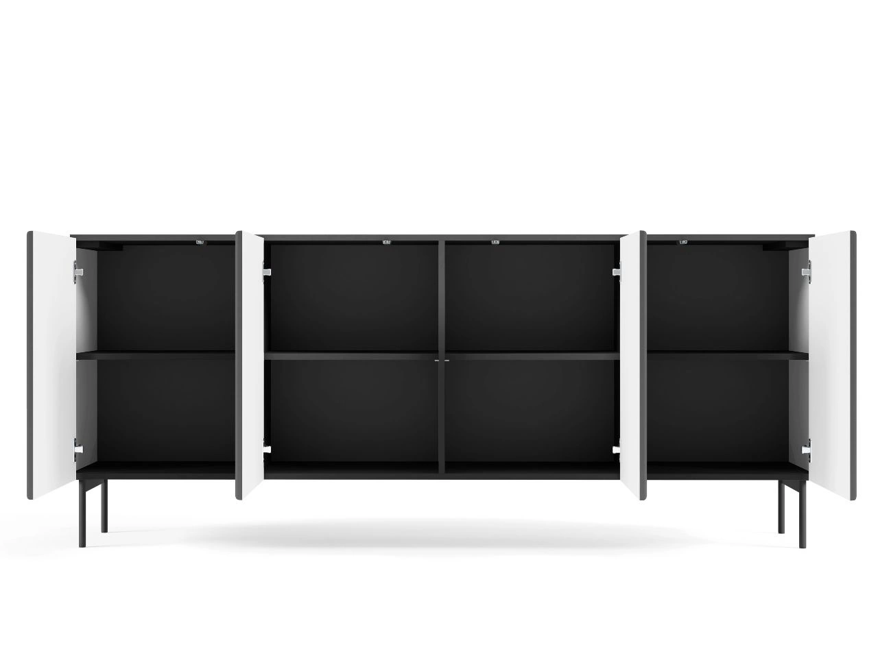 Zastosowany system push-to-open eliminuje potrzebę montowania uchwytów — wystarczy lekkie naciśnięcie, aby otworzyć drzwi. Rozwiązanie to podkreśla minimalistyczny charakter komody i zwiększa komfort codziennego użytkowania. Całość wspiera się na metalowych, smukłych nogach, które dodają lekkości oraz wprowadzają subtelny, industrialny akcent.