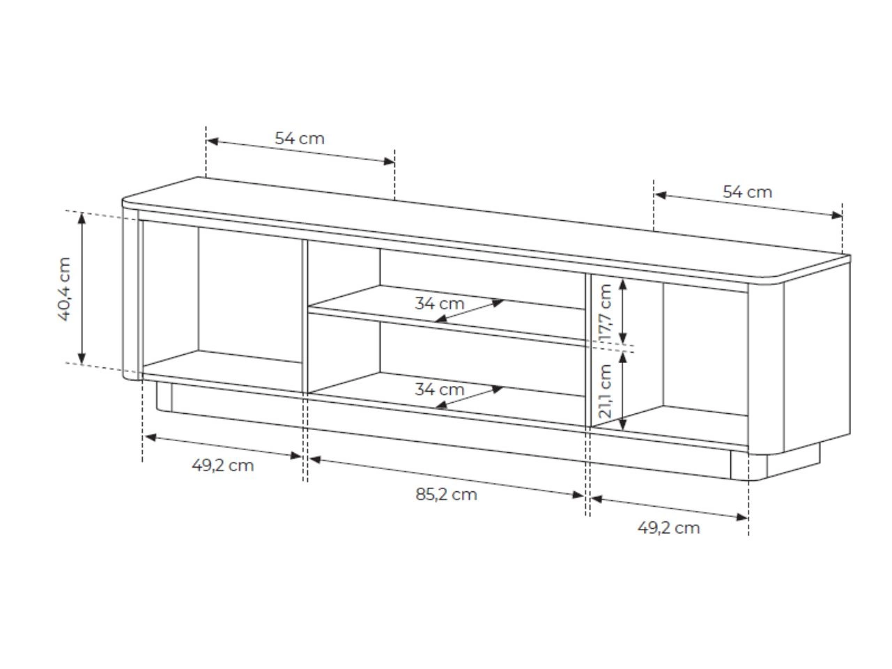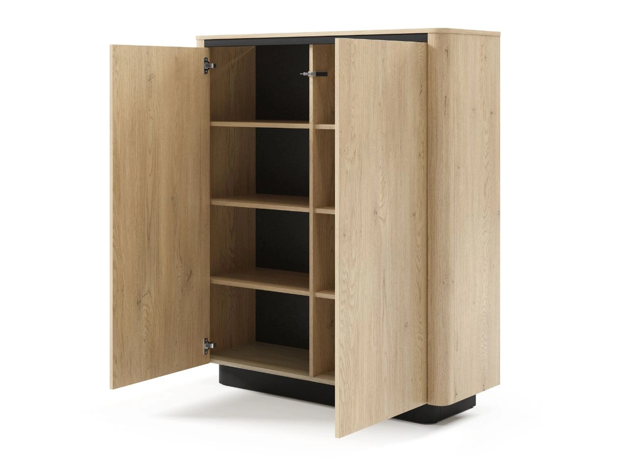 Wysoka komoda skrywa za dwojgiem drzwi pojemne wnętrze podzielone za pomocą półek na mniejsze sekcje. Szafka RTV posiada centralne drzwiczki uchylane ku dołowi, a w celu uniknięcia ich swobodnego opadania, zastosowano praktyczne siłowniki. Nad opisaną szafką znajduje się ponadto wnęka na sprzęt multimedialny. W jej tylnej ściance wycięto okrągły otwór, pozwalający na estetyczne wyprowadzenie kabli na zewnątrz.