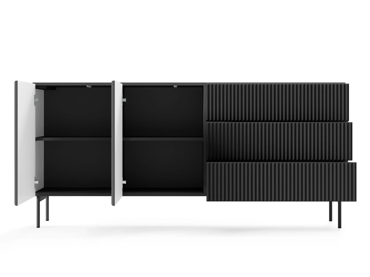 Kolekcja Qualita to nowoczesny zestaw mebli w eleganckim, czarnym wykończeniu. W skład serii wchodzą komoda wysoka, komoda szeroka oraz szafka RTV, tworzące harmonijną i spójną aranżację. Charakterystyczne ryflowane fronty MDF, prosta forma oraz metalowe nogi podkreślają nowoczesny, lekki design kolekcji.
