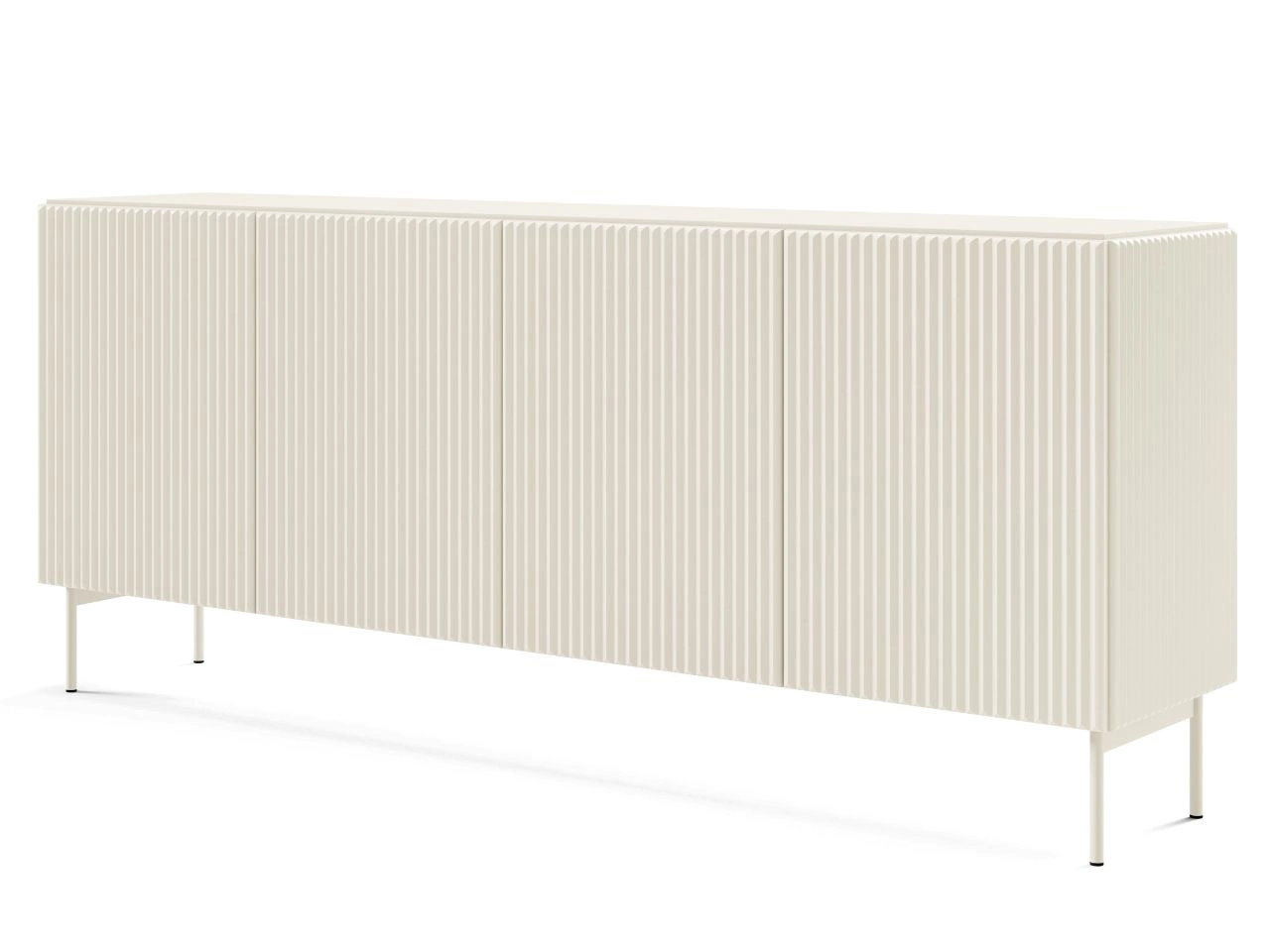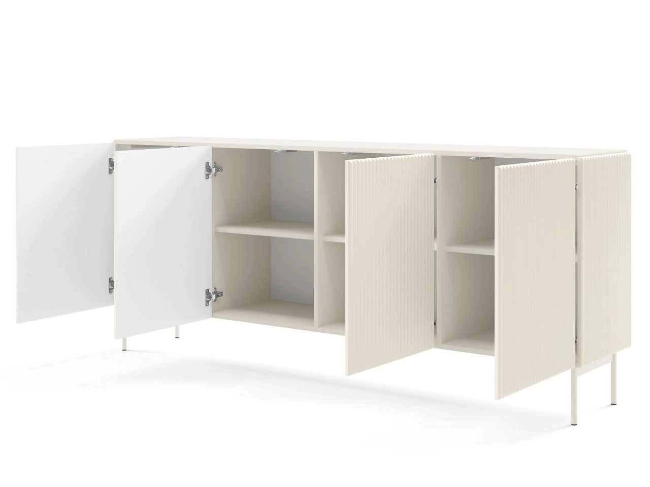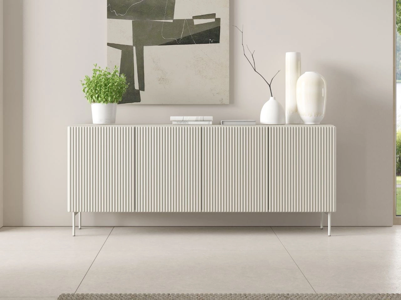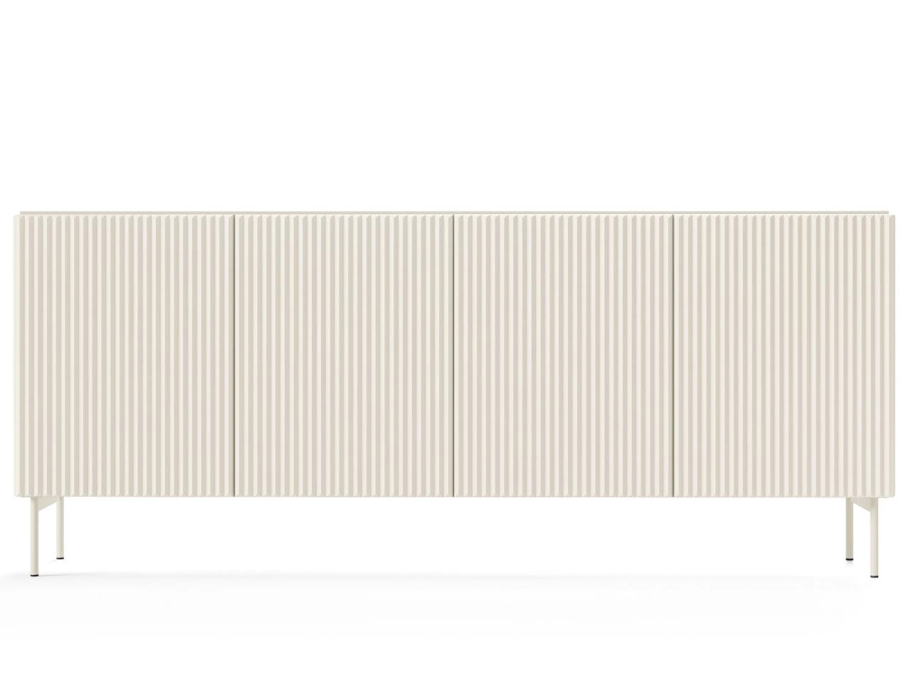 Fronty wykonano w identycznej, ryflowanej strukturze jak korpus, dzięki czemu całość prezentuje się jednolicie i nowocześnie. Komoda wyposażona jest w cztery zamykane szafki, które oferują praktyczną i dobrze zorganizowaną przestrzeń do przechowywania. Tylna ściana została wzmocniona płytą HDF, co dodatkowo usztywnia konstrukcję oraz gwarantuje schludne i spójne wykończenie wnętrza mebla.
