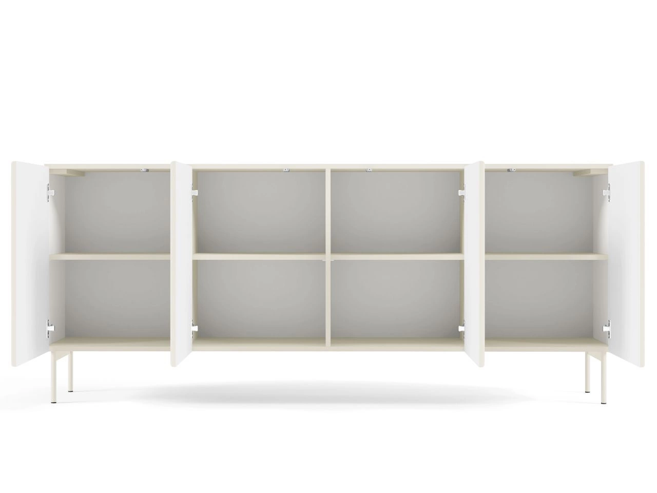 Zastosowany system push-to-open eliminuje potrzebę montowania uchwytów — wystarczy lekkie naciśnięcie, aby otworzyć drzwi. Rozwiązanie to podkreśla minimalistyczny charakter komody i zwiększa komfort codziennego użytkowania. Całość wspiera się na metalowych, smukłych nogach, które dodają lekkości oraz wprowadzają subtelny, industrialny akcent.