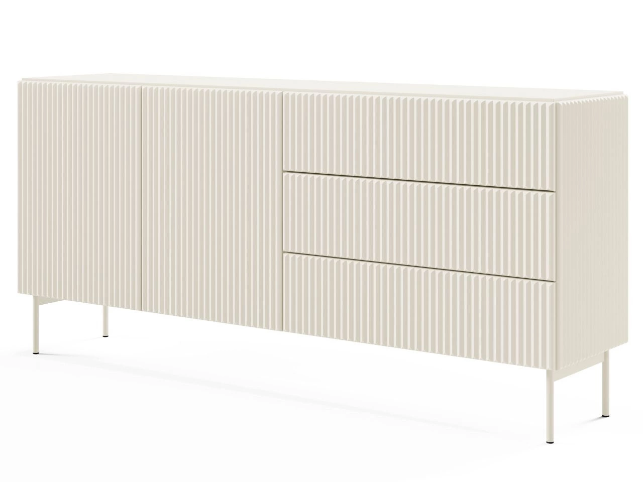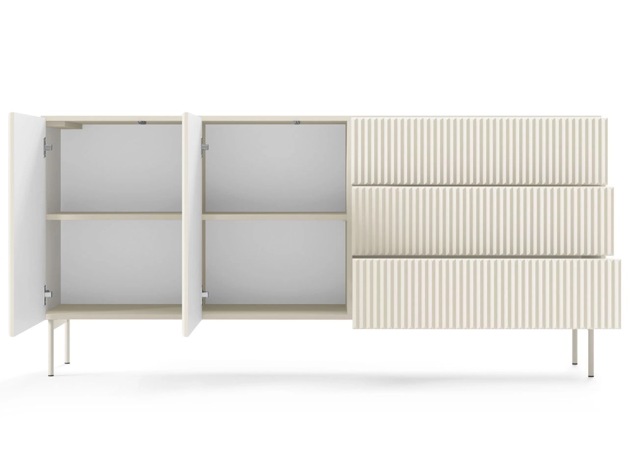 Zastosowany system push-to-open eliminuje potrzebę montowania uchwytów — wystarczy delikatne naciśnięcie, aby otworzyć front lub szufladę. Rozwiązanie to podkreśla minimalistyczną formę komody i zwiększa komfort użytkowania. Całość wspiera się na metalowych, smukłych nogach, które dodają lekkości, stabilności i wprowadzają subtelny, industrialny akcent.