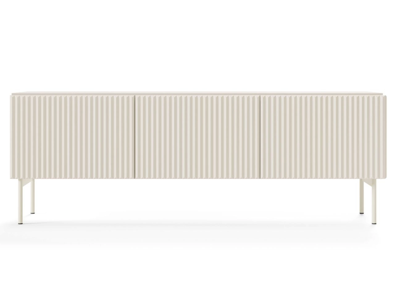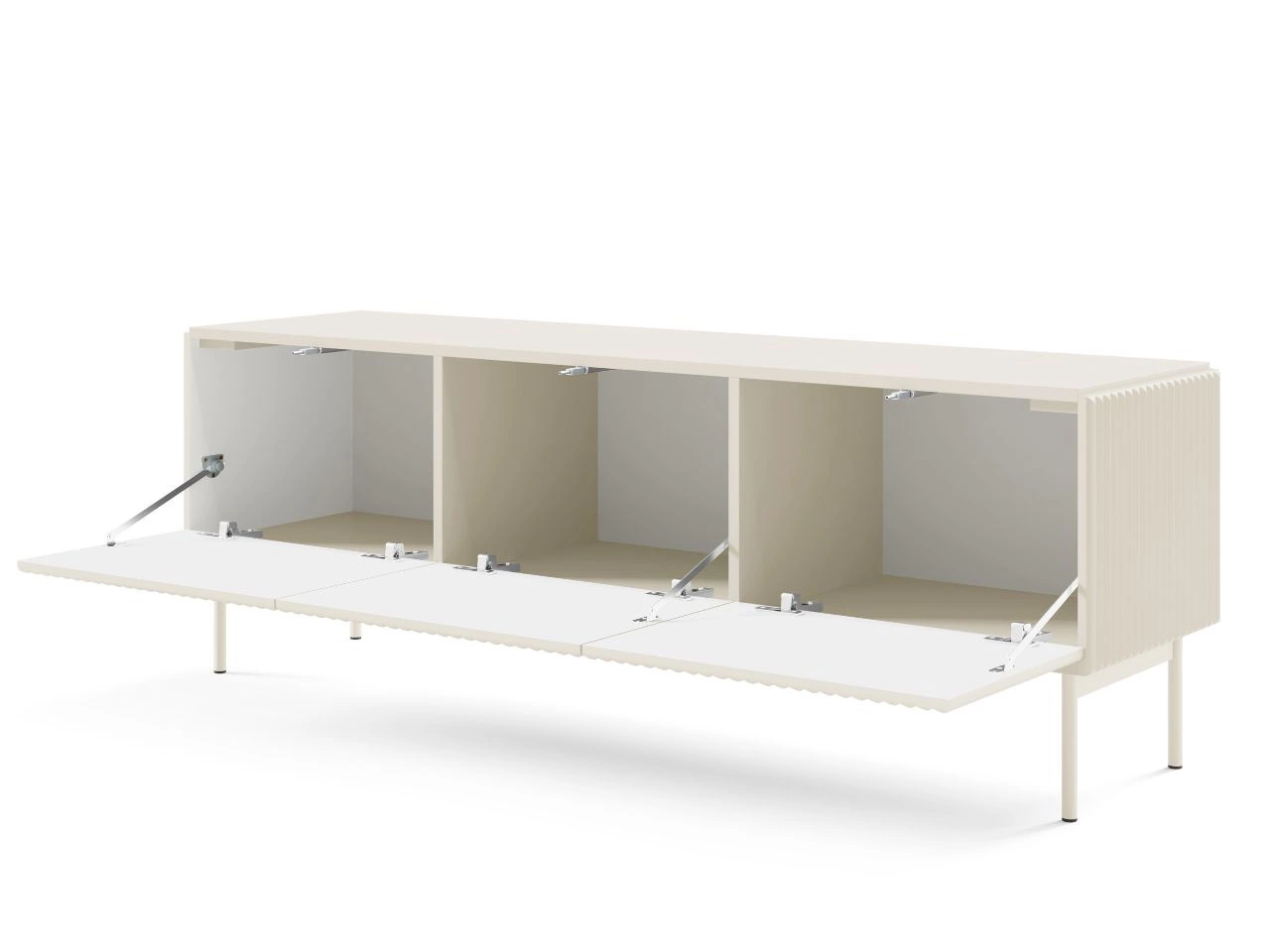 Szafka RTV na nóżkach wyposażona jest w trzy pojemne komory zamykane uchylnymi frontami, które otwierają się w dół, ułatwiając dostęp do przechowywanej elektroniki, kabli lub akcesoriów. Solidne mechanizmy podnośnikowe gwarantują płynne i stabilne otwieranie, a pełne, ryflowane fronty podkreślają nowoczesny charakter mebla i pozwalają zachować estetyczny, uporządkowany wygląd strefy RTV. Wnętrze zostało dodatkowo wzmocnione płytą HDF, co podkreśla jakość wykonania i zapewnia estetyczne wykończenie.
