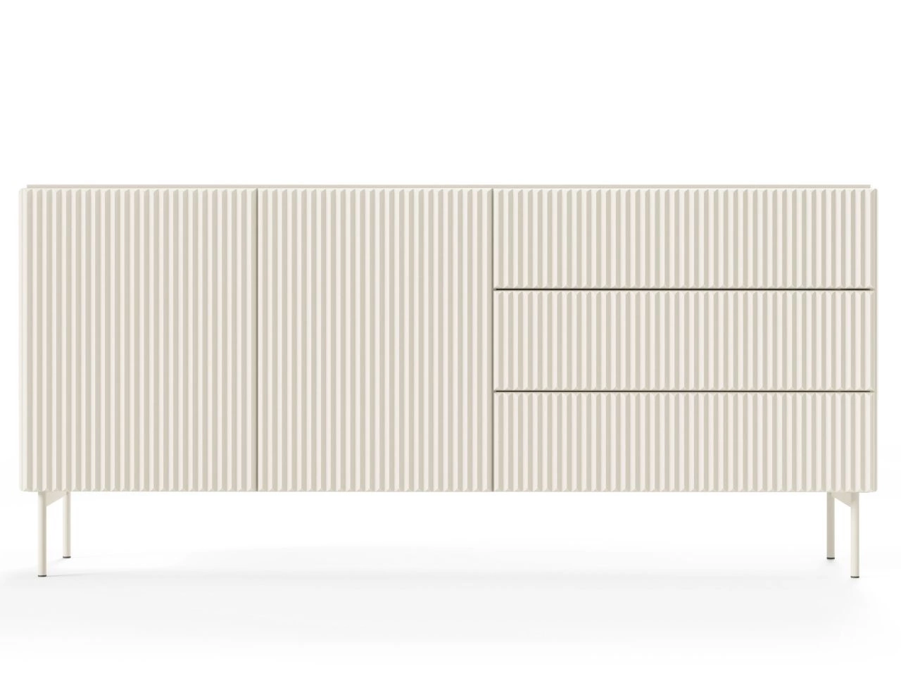 Komoda szeroka łączy pojemne szuflady i zamykane przestrzenie, dzięki czemu świetnie sprawdza się do organizacji codziennych akcesoriów. Jej szeroka forma i ryflowane fronty podkreślają styl całej kolekcji.