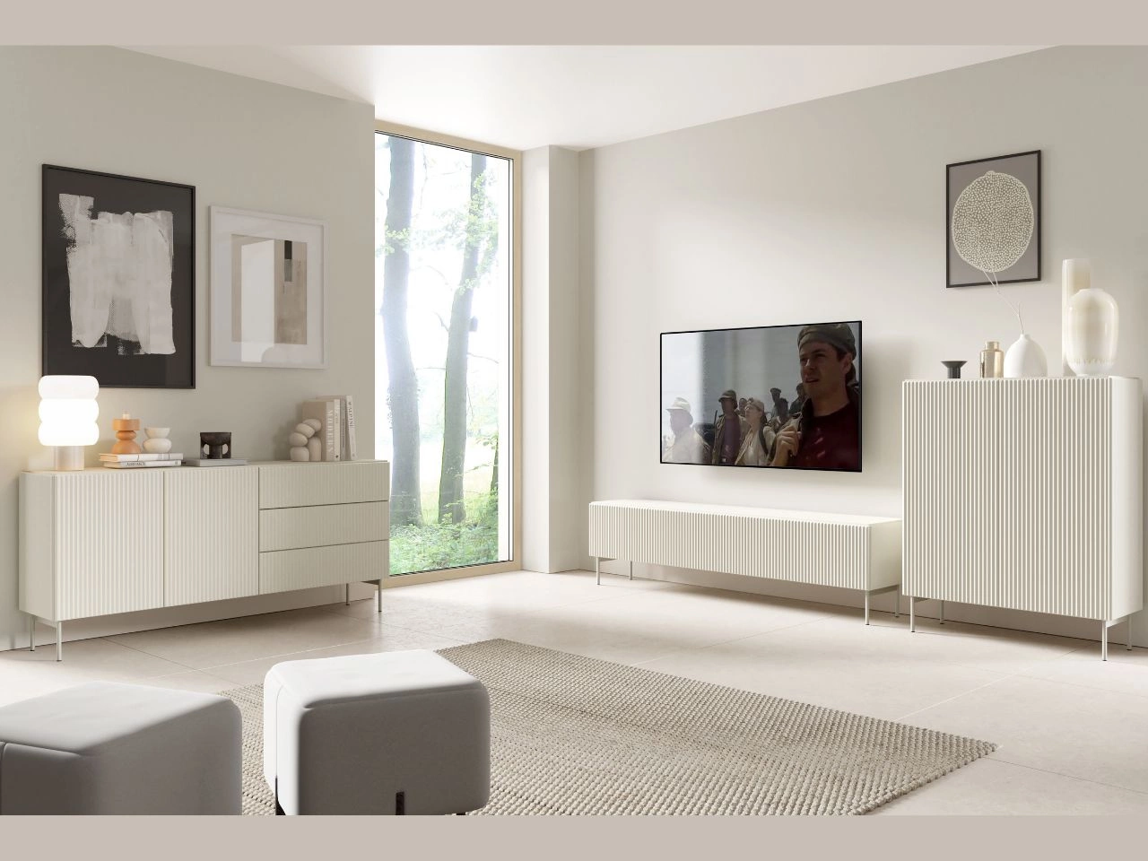 Szafka RTV oferuje miejsce na sprzęt i dodatki multimedialne, pozwalając zachować porządek w strefie wypoczynkowej. Przemyślany układ schowków i ryflowane fronty nadają jej nowoczesny charakter.