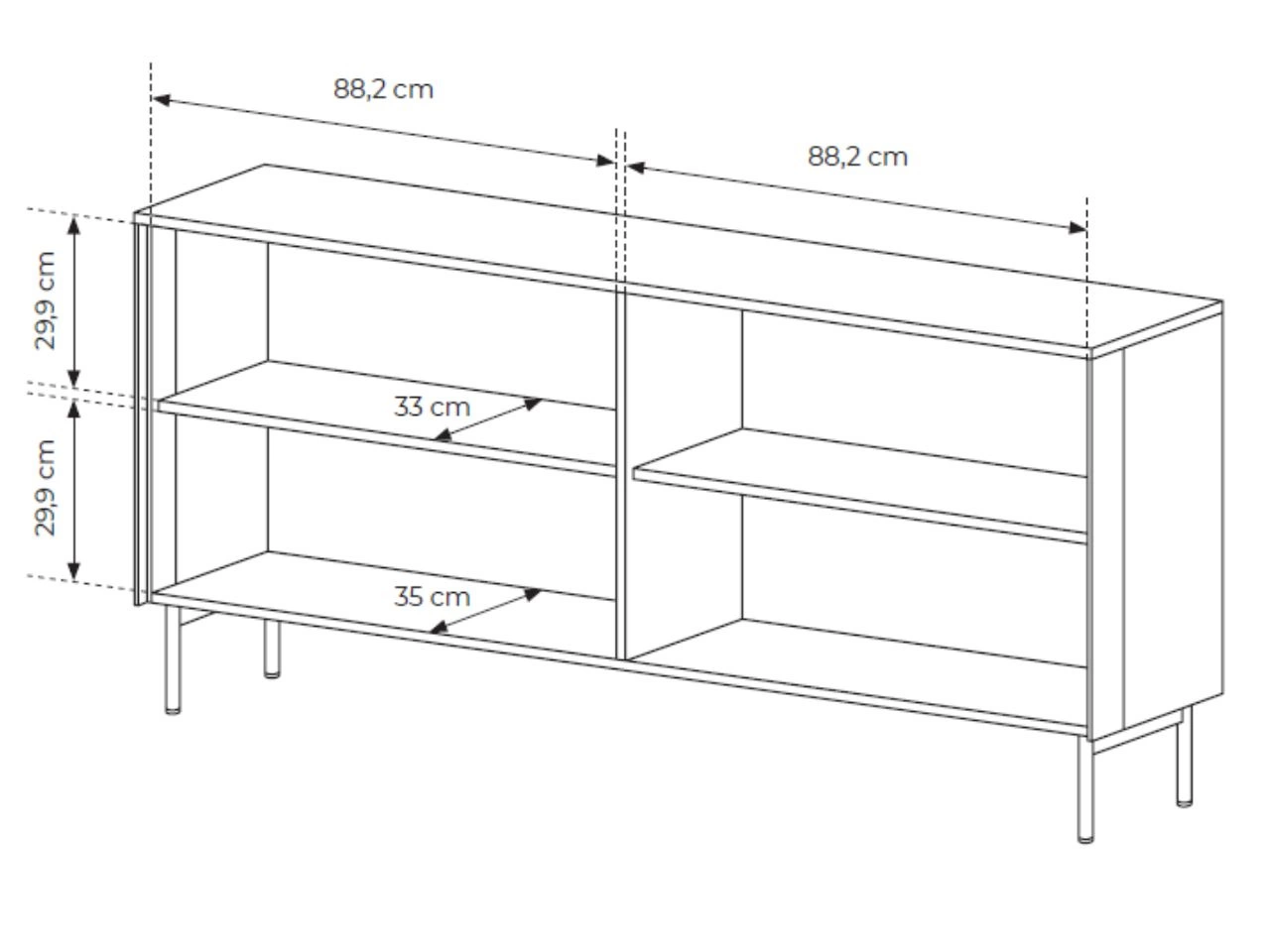 Komoda opiera się na czarnych metalowych nogach, które nadają bryle lekkości i podkreślają loftowy styl kolekcji. Za czterema drzwiczkami znajdują się pojemne półki, zapewniające dużo miejsca na przechowywanie zastawy, dekoracji lub dokumentów. Wnętrze zostało dodatkowo wyposażone w oświetlenie LED w ciepłej barwie, które podkreśla strukturę drewna i pozwala wykorzystać komodę także jako elegancką witrynę ekspozycyjną.