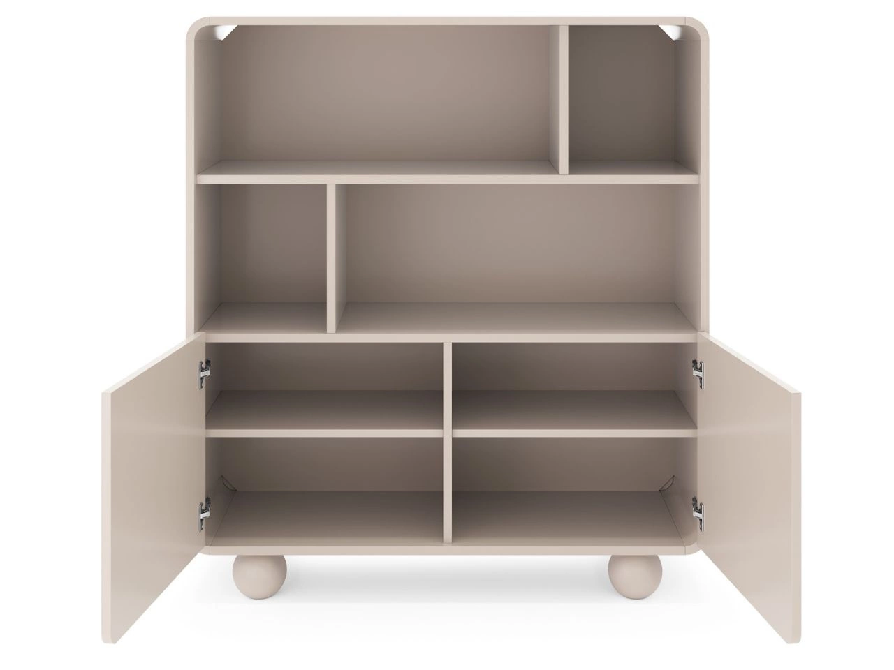 Regał na książki wyposażono w dwie praktyczne szafki z systemem push to open – wystarczy lekkie dotknięcie, by fronty otworzyły się płynnie i bezgłośnie. Otwarta część regału z półkami to idealne miejsce na książki, dekoracje, rośliny lub akcesoria, które chcesz eksponować, tworząc spójną i uporządkowaną przestrzeń w salonie lub biurze. Całość wspiera się na geometrycznych, okrągłych nóżkach, również w kolorze kaszmir, które dodają konstrukcji lekkości i nowoczesnego charakteru.