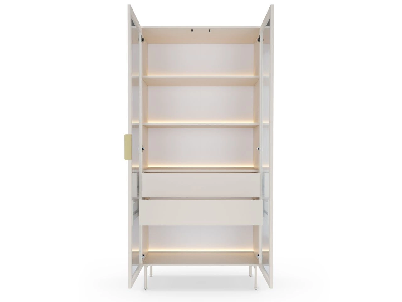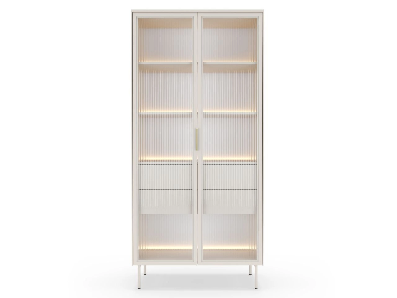 Design witryny na nóżkach uzupełniają metalowe nóżki w kolorze kaszmir oraz elegancki metalowy uchwyt w złotej anodzie, które nadają bryle nowoczesnej, delikatnej formy.