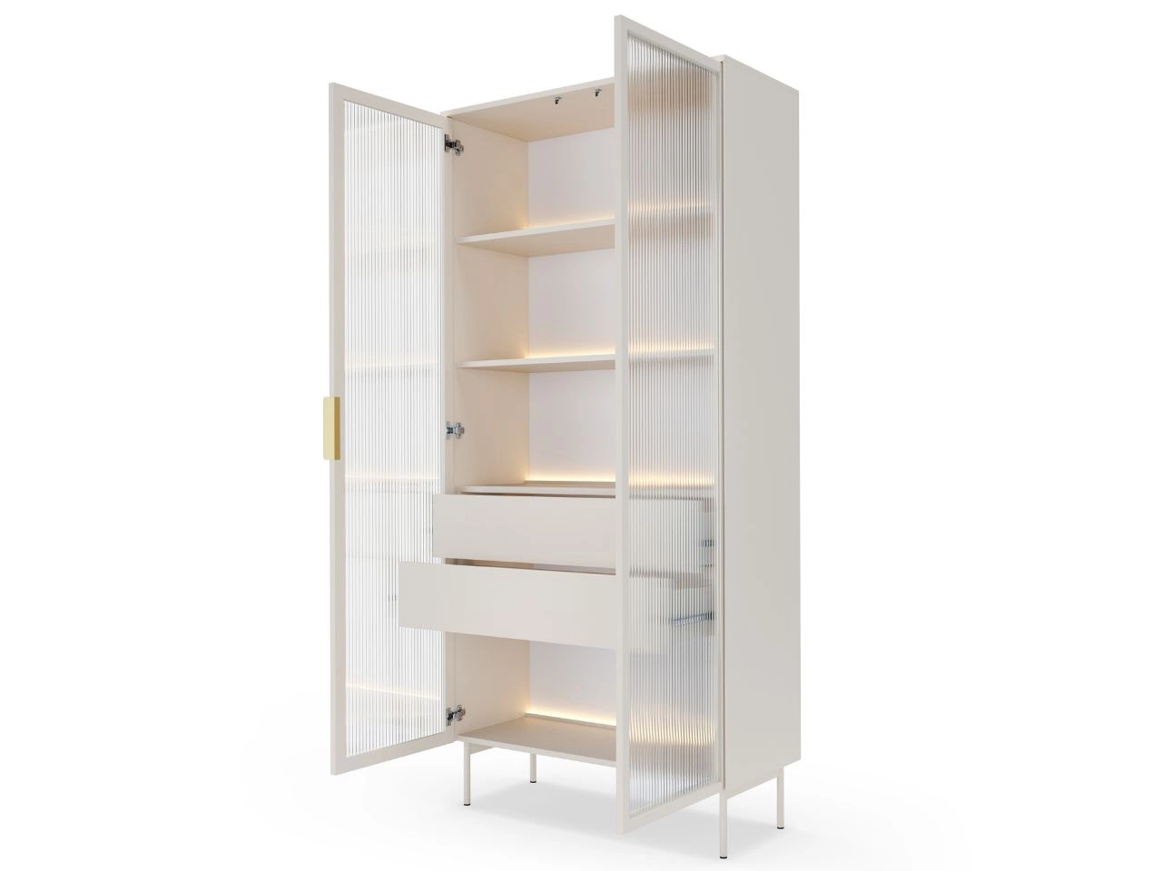 Fronty składają się z ramki MDF oraz hartowanej szyby ornamentowej flutes, która delikatnie rozprasza światło i nadaje całej bryle subtelnej lekkości. Tylna ściana z płyty HDF oraz kolorystycznie dopasowane obrzeża ABS dbają o trwałość i estetykę wnętrza witryny.