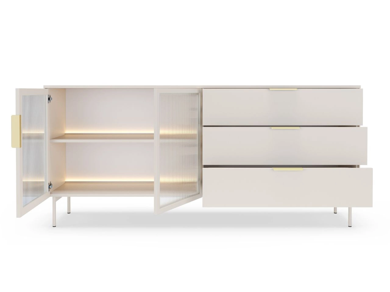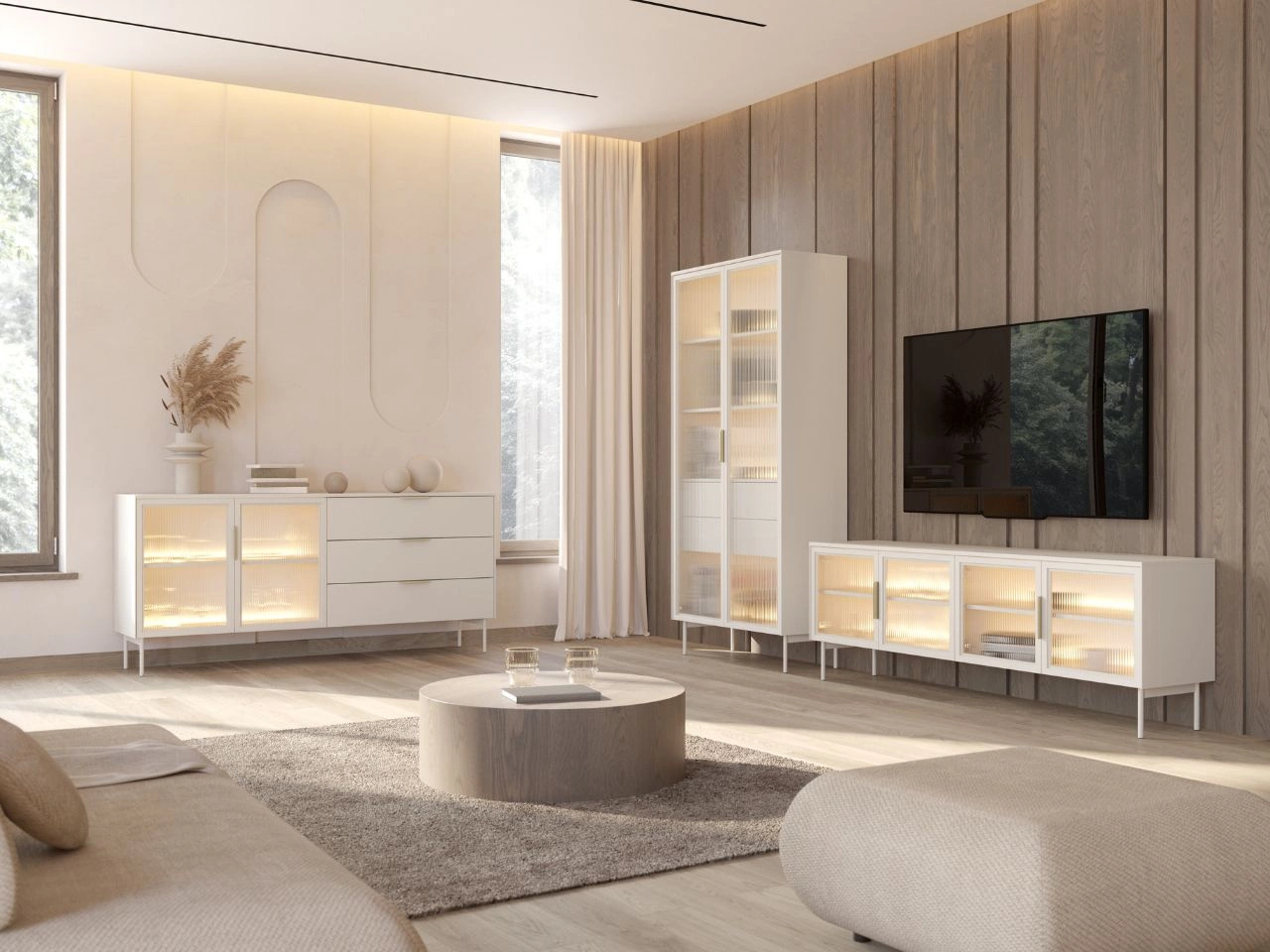 W części przeszklonej zastosowano oświetlenie LED o neutralnej barwie, które subtelnie podkreśla wnętrze i tworzy nastrojowe światło idealne do ekspozycji dekoracji, szkła lub ulubionych dodatków. Pionowe ryflowanie szkła flutes dodaje komodzie elegancji i nowoczesnego charakteru.