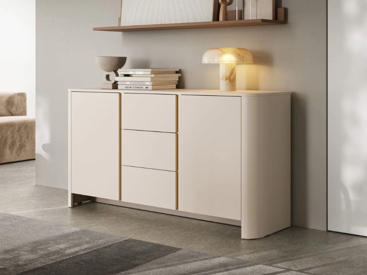 Całość wykończono obrzeżem ABS, a delikatne zaokrąglenia oraz pionowa, złota listwa dekoracyjna nadają komodzie subtelnego, luksusowego charakteru. Modny, ciepły kolor kaszmir sprawia, że komoda do salonu wygląda lekko, nowocześnie i harmonijnie, wprowadzając do wnętrza poczucie stylu i spójności. To mebel, który łączy funkcjonalność, wygodę i estetykę, a jego ponadczasowy design sprawia, że doskonale komponuje się z różnorodnymi aranżacjami, od minimalistycznych po nowoczesne.