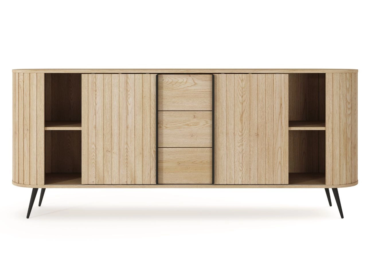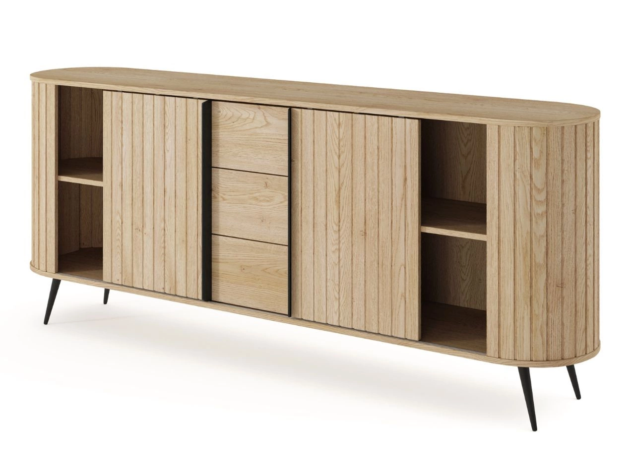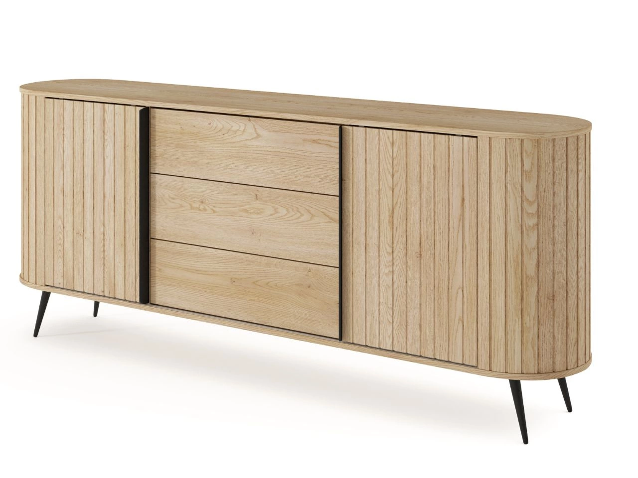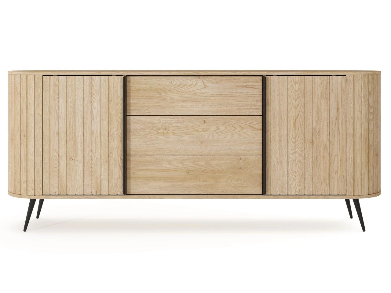 Komoda Passione to niezwykle elegancki mebel, który przyciąga wzrok swoimi ciekawymi detalami i rozwiązaniami stylistycznymi. Pierwszą rzeczą, która rzuca się w oczy, są ryflowanie fronty oraz zaokrąglone rogi mebla, które kojarzy się z aranżacjami vintage.