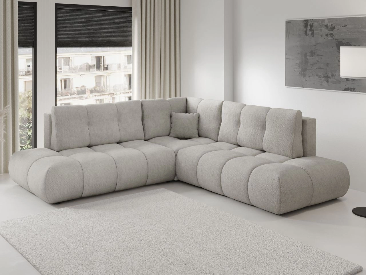 Narożnik Kair to nowoczesny i niezwykle komfortowy narożnik tapicerowany zaprojektowany z myślą o codziennym relaksie. Jego miękka, zaokrąglona forma oraz szerokie, głębokie siedziska tworzą wyjątkowo przytulną przestrzeń wypoczynkową, idealną do salonu. Tapicerka wykonana z tkaniny o wyraźnej, strukturalnej fakturze nadaje meblowi elegancki, ponadczasowy charakter i sprawia, że doskonale wpisuje się zarówno w aranżacje skandynawskie, jak i współczesne, minimalistyczne wnętrza.