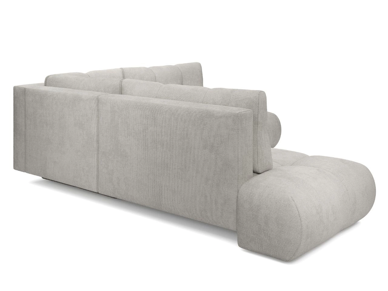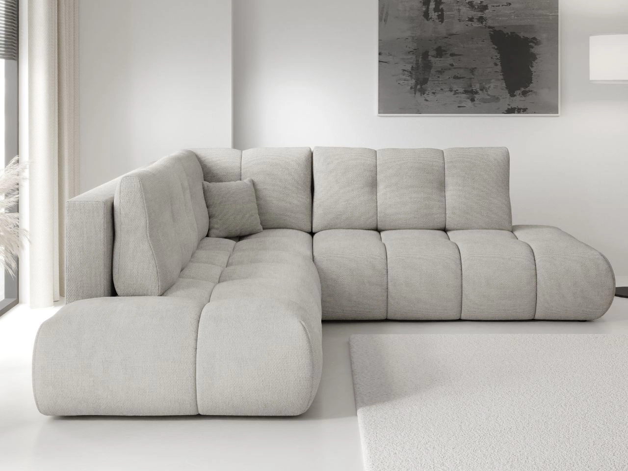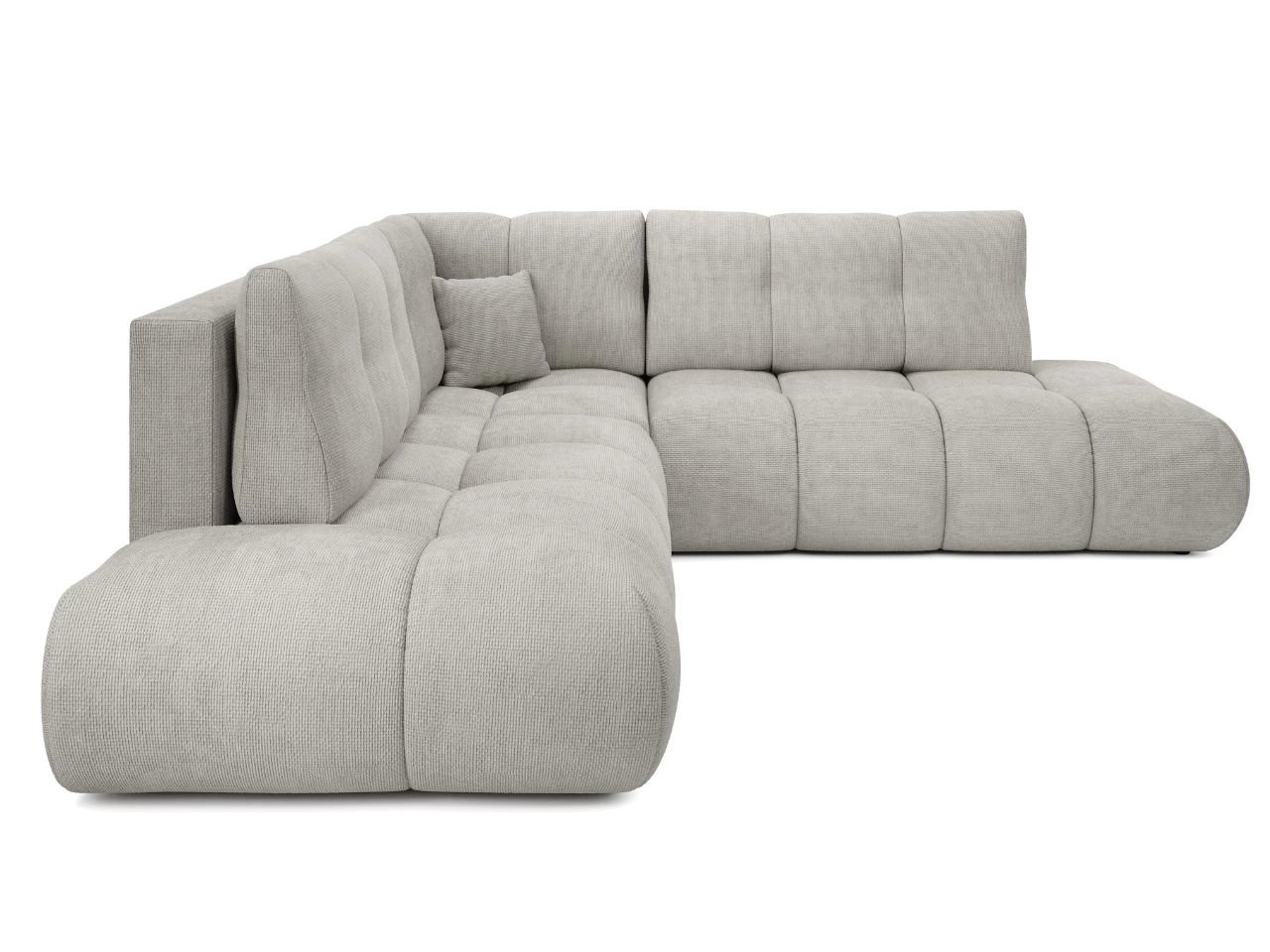 Siedzisko oparte na miękkim wypełnieniu zapewnia odpowiednią sprężystość i wysoki komfort nawet przy intensywnym użytkowaniu. Wysokie, profilowane oparcia oraz luźna poduszka dekoracyjna gwarantują wygodne podparcie pleców, sprzyjając długiemu wypoczynkowi. Kształt narożnika tworzy przestronną strefę relaksu, idealną do wspólnego spędzania czasu, oglądania filmów czy popołudniowego odpoczynku.